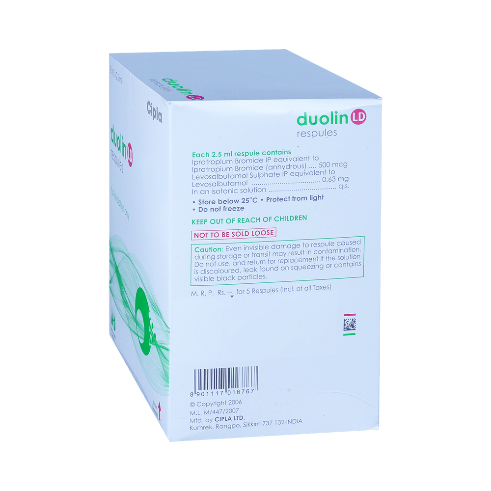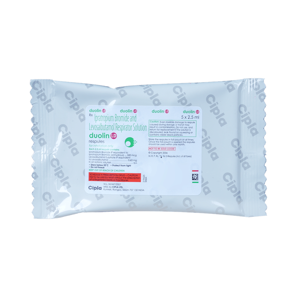 DUOlin LD Respules (2.5ml Each) is used for the treatment of chronic obstructive pulmonary disorder (a lung disorder in which the flow of air to the lungs is blocked). It helps in relaxing the muscles of the air passages and making it easier to breathe. It relieves coughing, wheezing and feeling short of breath. Your doctor will tell you how often you need to use your inhaler. The effect of this medicine may be noticeable after a few days but will only reach its maximum after a few weeks. This medicine must be used regularly to be effective, so go on taking it even if you don't have any symptoms. That means it’s doing its job. If you stop taking it your COPD may get worse. This medicine should not be used to relieve sudden shortness of breath. If sudden shortness of breath occurs, use your rescue inhaler. To get the benefit from this medicine you need to make sure you get your inhaler technique right, otherwise, it Does not work as well.The most common side effects are dryness in mouth, shortness of breath, cough, tremor, headache, palpitations, and muscle cramp. If you get there, don’t stop taking it but do talk to your doctor. You can prevent some of these symptoms by rinsing your mouth and throat with water or brushing your teeth after using your inhaler. There are other, rarer side effects which can be serious. Talk to your doctor if you're worried about them.Before taking it, you should tell your doctor if you have any kidney or liver diseases so that your doctor can prescribe a suitable dose for you. Also tell your doctor if you are pregnant, planning pregnancy or breastfeeding.
