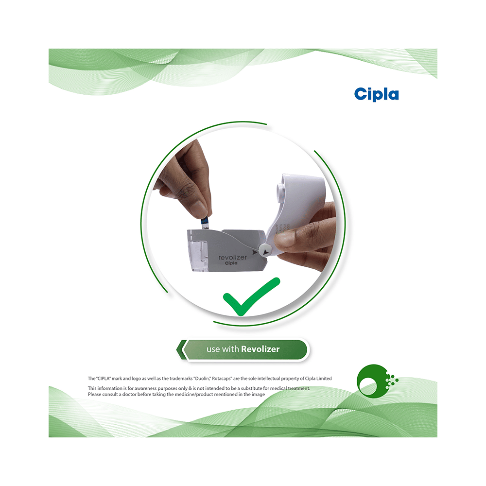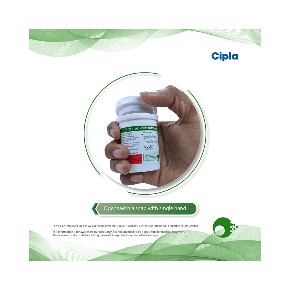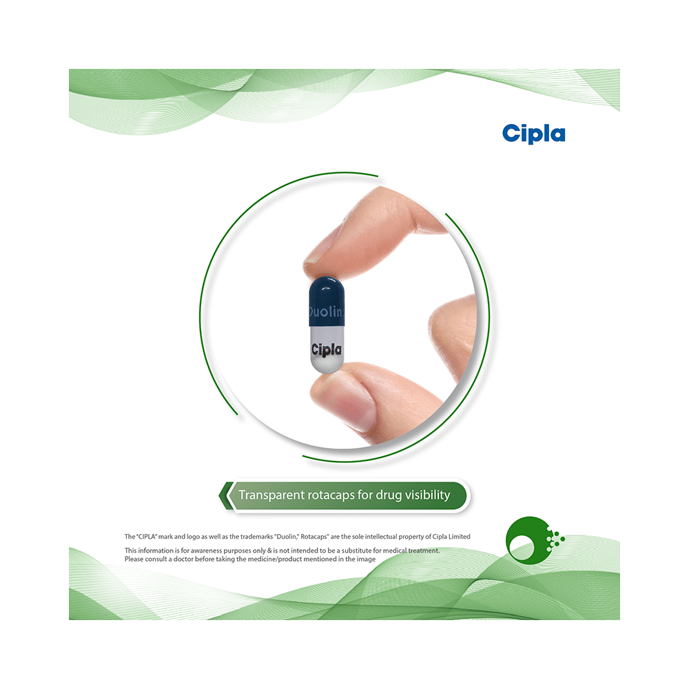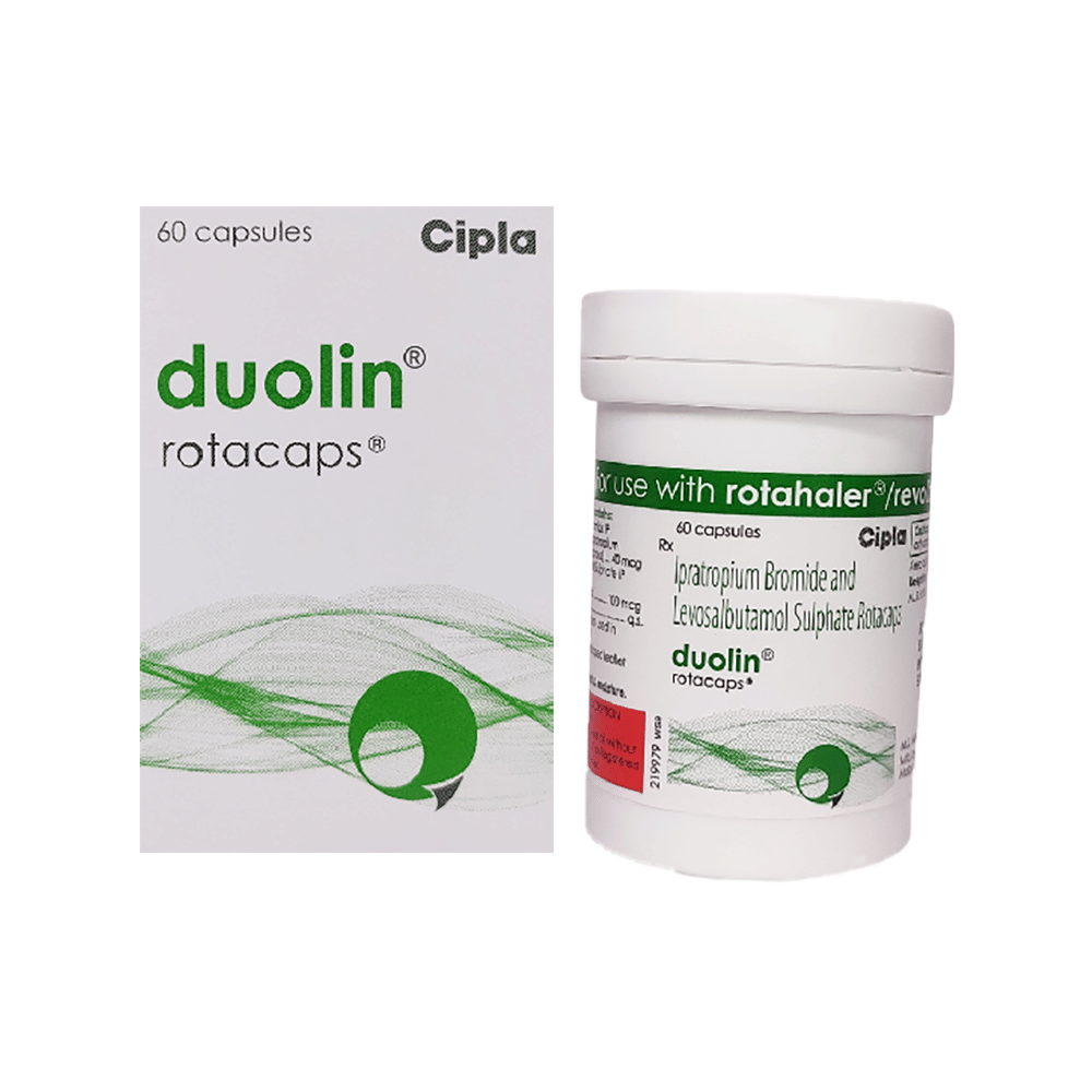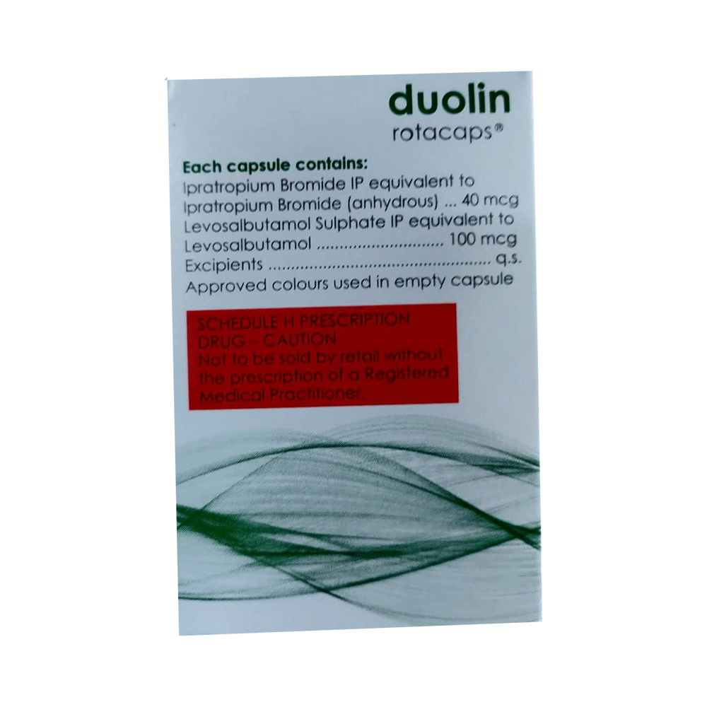 DUOlin Rotacap is used for the treatment of chronic obstructive pulmonary disorder (a lung disorder in which the flow of air to the lungs is blocked). It helps in relaxing the muscles of the air passages and making it easier to breathe. It relieves coughing, wheezing and feeling short of breath. Your doctor will tell you how often you need to use your inhaler. The effect of this medicine may be noticeable after a few days but will only reach its maximum after a few weeks. This medicine must be used regularly to be effective, so go on taking it even if you don't have any symptoms. That means it’s doing its job. If you stop taking it your COPD may get worse. This medicine should not be used to relieve sudden shortness of breath. If sudden shortness of breath occurs, use your rescue inhaler. To get the benefit from this medicine you need to make sure you get your inhaler technique right, otherwise, it Does not work as well.The most common side effects are dryness in mouth, shortness of breath, cough, tremor, headache, palpitations, and muscle cramp. If you get there, don’t stop taking it but do talk to your doctor. You can prevent some of these symptoms by rinsing your mouth and throat with water or brushing your teeth after using your inhaler. There are other, rarer side effects which can be serious. Talk to your doctor if you're worried about them.Before taking it, you should tell your doctor if you have any kidney or liver diseases so that your doctor can prescribe a suitable dose for you. Also tell your doctor if you are pregnant, planning pregnancy or breastfeeding.
