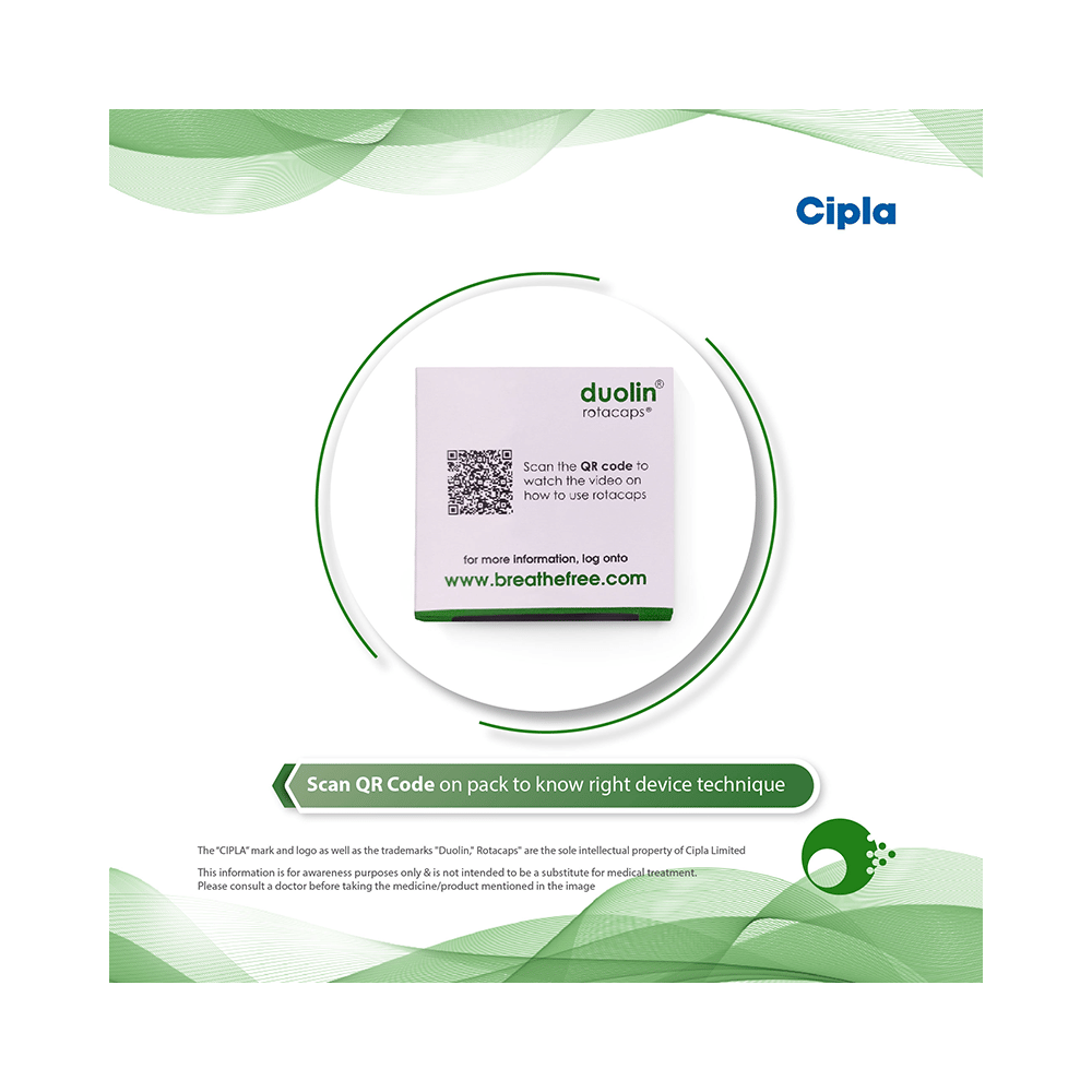 In Treatment and prevention of AsthmaAsthma is a disease of the lungs that makes breathing difficult. It is caused by swelling of the airways that carry air in and out of the lungs. DUOlin Rotacap reduces swelling of the airways and widens it. This makes it easier for air to move in and out of the lungs.In Treatment of Chronic obstructive pulmonary disease (COPD)DUOlin Rotacap is a combination of medicines that helps the airways in your lungs stay open. They work by relaxing the muscles of these airways. This makes it easier for air to get in and out. It will relieve symptoms such as tightness in your chest, shortness of breath, wheezing and coughing and help you carry out your daily activities more easily. DUOlin Rotacap is a safe and effective medicine. It usually starts to work within a few minutes and the effects can last up to several hours. Do not stop using it unless you are advised to by your doctor. You need to use your inhaler correctly for it to work properly. If you are not sure, ask your doctor or nurse.In Treatment and prevention of BronchitisDUOlin Rotacap relieve sudden constriction of the muscles in the walls of the airway and enhance the airflow. This reduces mucous production, and promote easier breathing. This way it helps in managing the symptoms of bronchitis and improving respiratory function, contributing to an improved overall well-being for individuals with this condition.show moreshow less