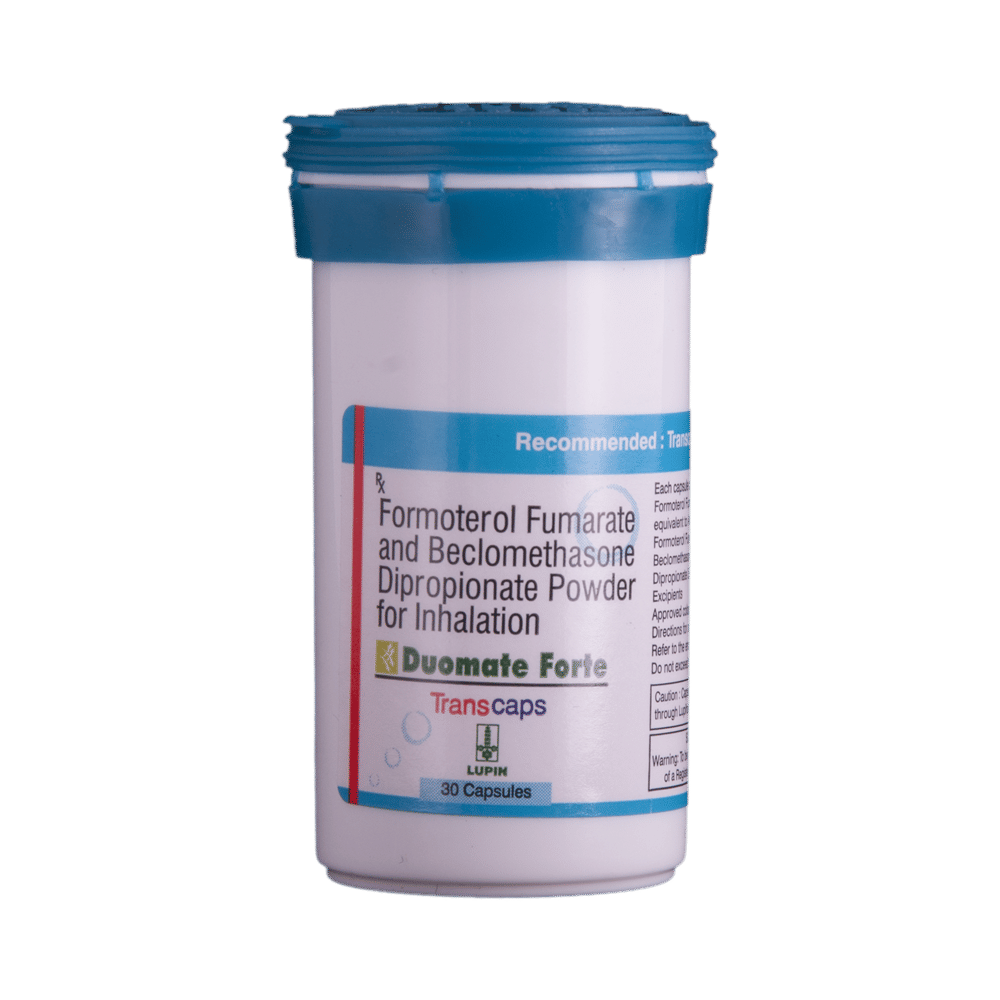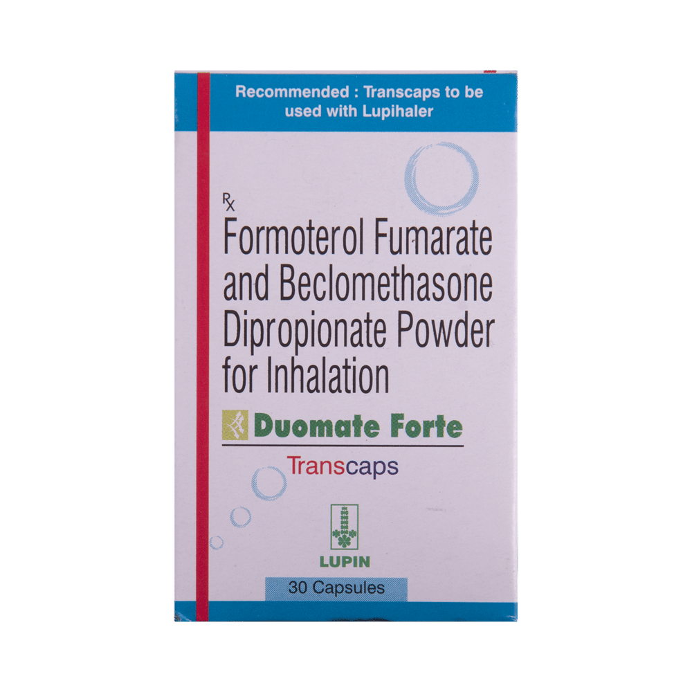 Duomate Forte Transcaps is used in the treatment of asthma (wheezing and shortness of breath) and chronic obstructive pulmonary disorder (a lung disorder in which the flow of air to the lungs is blocked). It relaxes the muscles of the air passages and making it easier to breathe. Your doctor will tell you how often you need to use your inhaler. It’s important that you take the lowest dose needed to effectively control your asthma. The effect of this medicine may be noticeable after a few days but will only reach its maximum after a few weeks. This medicine must be used regularly to be effective, so go on taking it even if you don't have any symptoms. That means it’s doing its job. If you stop taking it your asthma and COPD may get worse. It should not be used to relieve sudden asthma attacks. If an asthma attack occurs, use your quick-relief inhaler (reliever). To get the benefit from this medicine you need to make sure you get your inhaler technique right, otherwise, it Does not work as well.The most common side effects are nausea, vomiting, respiratory tract infection, fungal infections in the mouth, headache, dry mouth, hoarseness of voice, sore throat, cough, musculoskeletal (bone, muscle, or joint) pain, and increased heart rate. If you get there, don’t stop taking it but do talk to your doctor. You can help prevent some of these symptoms by rinsing your mouth and throat with water or brushing your teeth after using your inhaler. There are other, rarer side effects which can be serious. Talk to your doctor if you're worried about them. In general, you should be trying to avoid situations that make your asthma worse (your triggers) and try not to smoke.Ask your doctor whether it’s safe to take this medicine if you're pregnant or breastfeeding. Before taking it, you should tell your doctor if you have any kidney or liver diseases so that your doctor can prescribe a suitable dose for you.