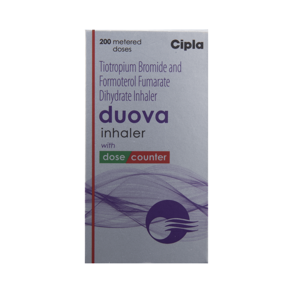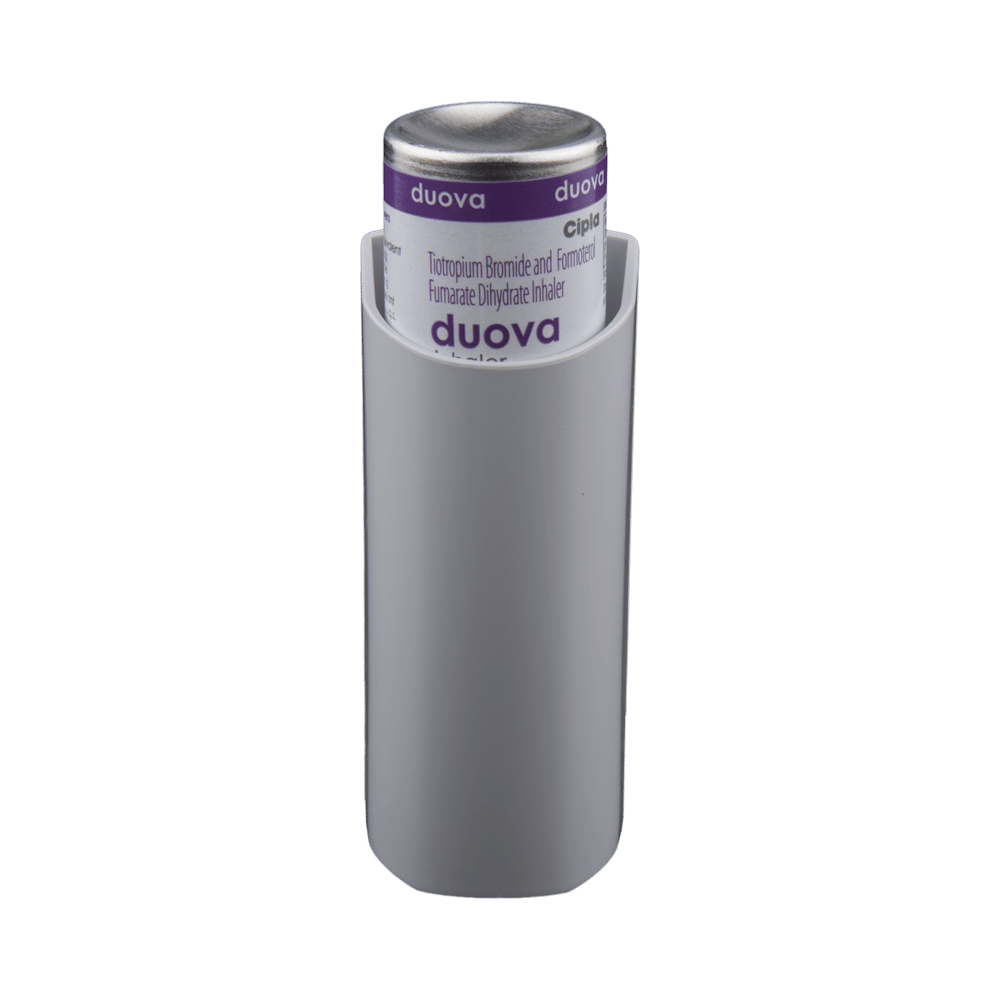 DUova Inhaler is used to treat chronic obstructive pulmonary disorder (a lung disorder in which the flow of air to the lungs is blocked). It helps in relaxing the muscles of the air passages and making it easier to breathe. It relieves coughing, wheezing, and shortness of breath. Your doctor will tell you how often you need to use your DUova Inhaler. The effect of this medicine may be noticeable after a few days, but will only reach its maximum after a few weeks. This medicine must be used regularly to be effective, so go on taking it even if you don't have any symptoms. If you stop taking it, your COPD may get worse. To get the benefit from this medicine, you need to make sure you get your inhaler technique right, otherwise, it does not work well.The most common side effects of DUova Inhaler are nausea, diarrhea, dry mouth, vomiting, dizziness, nasopharyngitis (inflammation of the throat and nasal passages), and insomnia. If you experience any of these symptoms, don’t stop taking it, but do talk to your doctor. You can prevent some of these symptoms by rinsing your mouth and throat with water or brushing your teeth after using your inhaler. If you experience any other symptoms and you are worried about them, consult your doctor.Before taking this medicine, you should tell your doctor if you are pregnant, planning pregnancy, or breastfeeding.