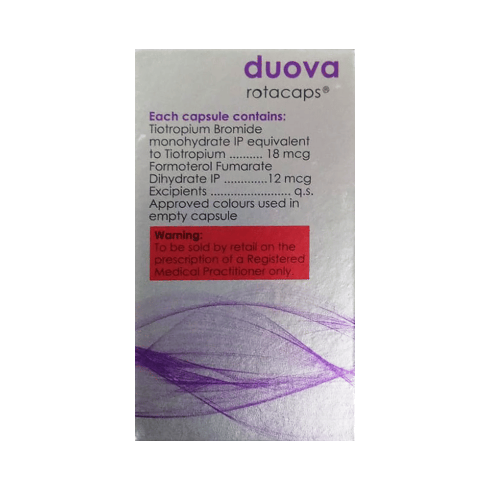 DUova Rotacap is used to treat chronic obstructive pulmonary disorder (a lung disorder in which the flow of air to the lungs is blocked). It helps in relaxing the muscles of the air passages and making it easier to breathe. It relieves coughing, wheezing, and shortness of breath. Your doctor will tell you how often you need to use your DUova Rotacap. The effect of this medicine may be noticeable after a few days, but will only reach its maximum after a few weeks. This medicine must be used regularly to be effective, so go on taking it even if you don't have any symptoms. If you stop taking it, your COPD may get worse. To get the benefit from this medicine, you need to make sure you get your inhaler technique right, otherwise, it does not work well.The most common side effects of DUova Rotacap are nausea, diarrhea, dry mouth, vomiting, dizziness, nasopharyngitis (inflammation of the throat and nasal passages), and insomnia. If you experience any of these symptoms, don’t stop taking it, but do talk to your doctor. You can prevent some of these symptoms by rinsing your mouth and throat with water or brushing your teeth after using your inhaler. If you experience any other symptoms and you are worried about them, consult your doctor.Before taking this medicine, you should tell your doctor if you are pregnant, planning pregnancy, or breastfeeding.