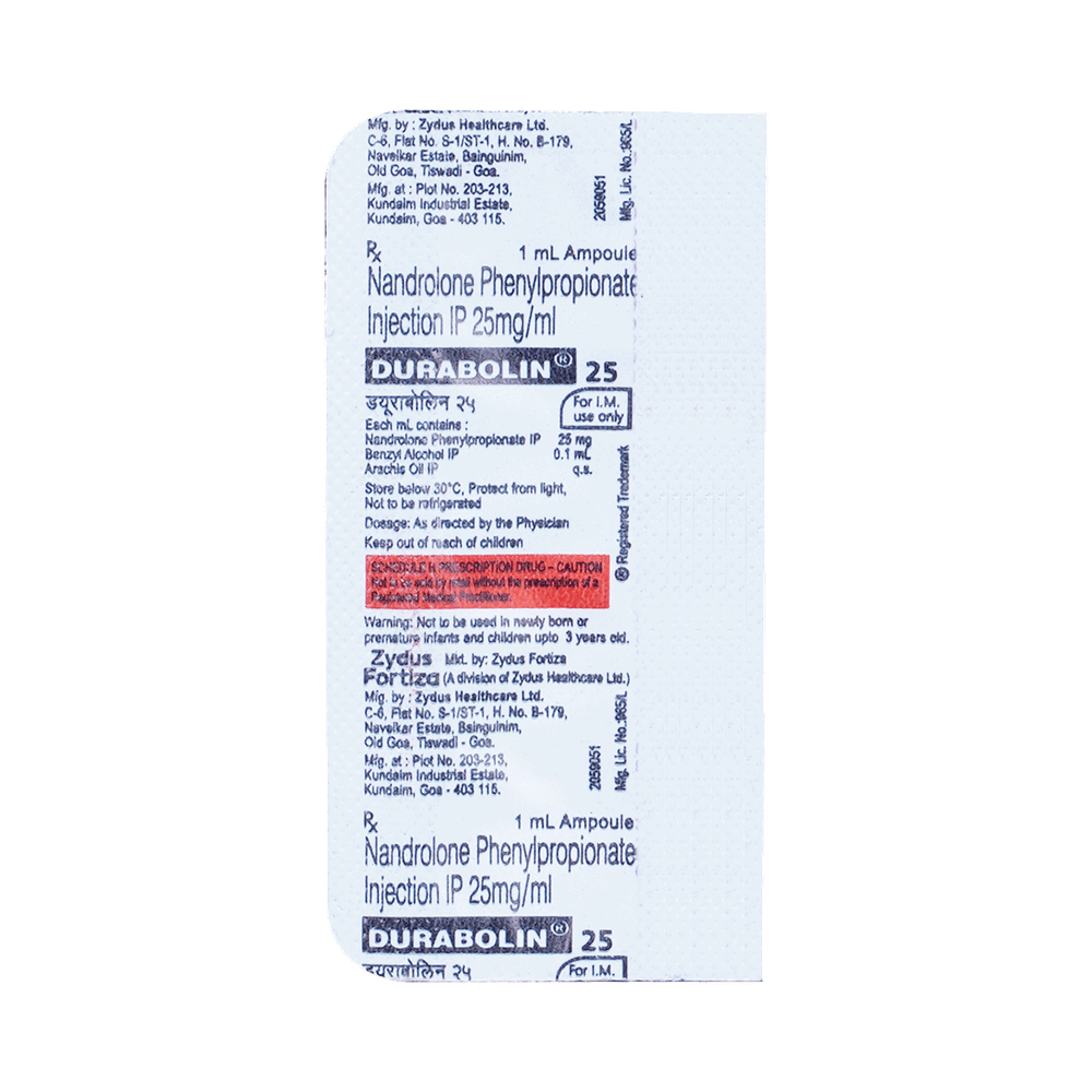 Durabolin 25 Injection is a medicine used in the treatment of osteoporosis in post-menopausal women. It helps strengthen the bones which become thin and brittle due to osteoporosis. Durabolin 25 Injection is generally given by a healthcare professional. You should not self-administer this medicine at home. Your doctor will decide the dose and how often you should take them. You should take it regularly to get the most benefit from it. Do not stop using the medicine even if you feel better unless the doctor tells you so.Using this medicine may cause few common side effects such as edema (swelling of legs, ankle, and feet), fluid retention, nausea, vomiting, acne, and breast enlargement. Let your doctor know if any of these side effects bother you.Before using this medicine, inform your doctor if you have any liver or kidney problems. You should also tell your doctor all the other medicines you are taking. Pregnant and breastfeeding mothers should consult with their doctors before using the medicine.