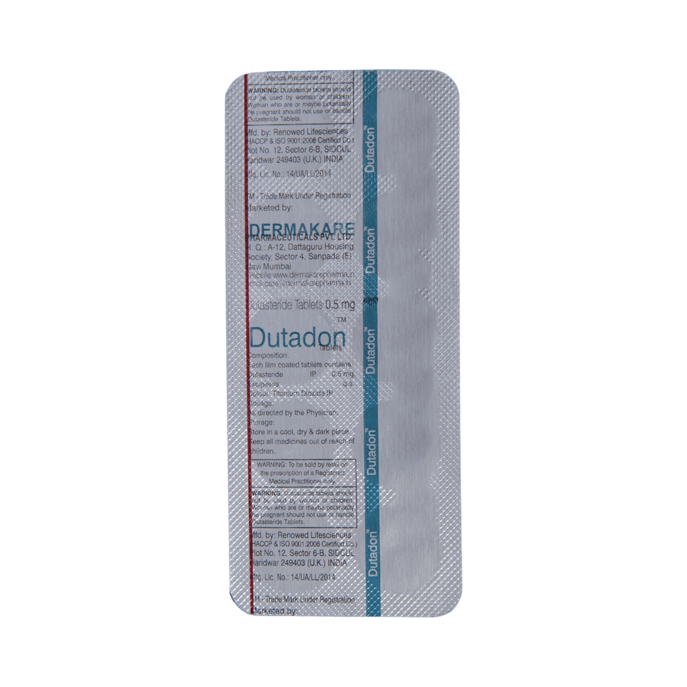 Dutadon Tablet is used in the treatment of benign prostatic hyperplasia. It shrinks the size of the enlarged prostate gland to relieve symptoms like pain and difficulty in passing urine. Dutadon Tablet should be taken by mouth with or without food. This medicine is given for a long time and takes a few months to show its effects. Thus, it is important to take it as advised by the doctor and complete the full course of treatment.Common side effects of Dutadon Tablet include low sexual drive, ejaculation disorder, breast enlargement, and breast tenderness. If any of these side effects bother you, consult your doctor for guidance.It is advised not to donate blood for 6 months after taking the last dose of Dutadon Tablet. Let your doctor know if you have any other preexisting medical conditions before using this medicine. Let your doctor also know if you have a history of allergic reactions to any of the ingredients in this medicine. Dutadon Tablet is not indicated for use in women.