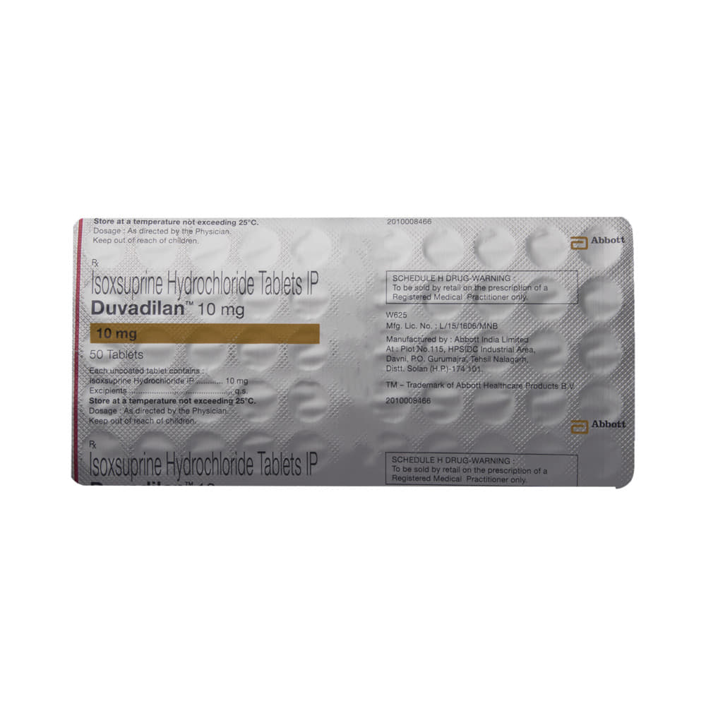 Duvadilan Tablet is a vasodilator and uterine relaxant. It is used in the treatment of premature labor (when the uterus starts contracting for birth too early than usual). It is also helpful in the treatment of peripheral vascular diseases. Duvadilan Tablet can be taken with or without food, but take it at the same time to get the most benefit. It should be taken as your doctor's advice. The dose and how often you take it depends on what you are taking it for. Your doctor will decide how much you need to improve your symptoms. Swallow the tablets whole with a glass of water. You should take this medicine for as long as it is prescribed for you.Dizziness is the most common side effect of the medicine. If these bother you or appear serious, let your doctor know. To lower the chance of dizziness, you must rise slowly, if getting up from a sitting or lying position or avoid driving or attention requiring activities.Before taking the medicine, tell your doctor if you have ever had heart problems or bleeding disorders. Your doctor should also know about all other medicines you are taking as many of these may make this medicine less effective or change the way it works. You must avoid taking part in any strenuous or stressful activities to prevent premature labor.