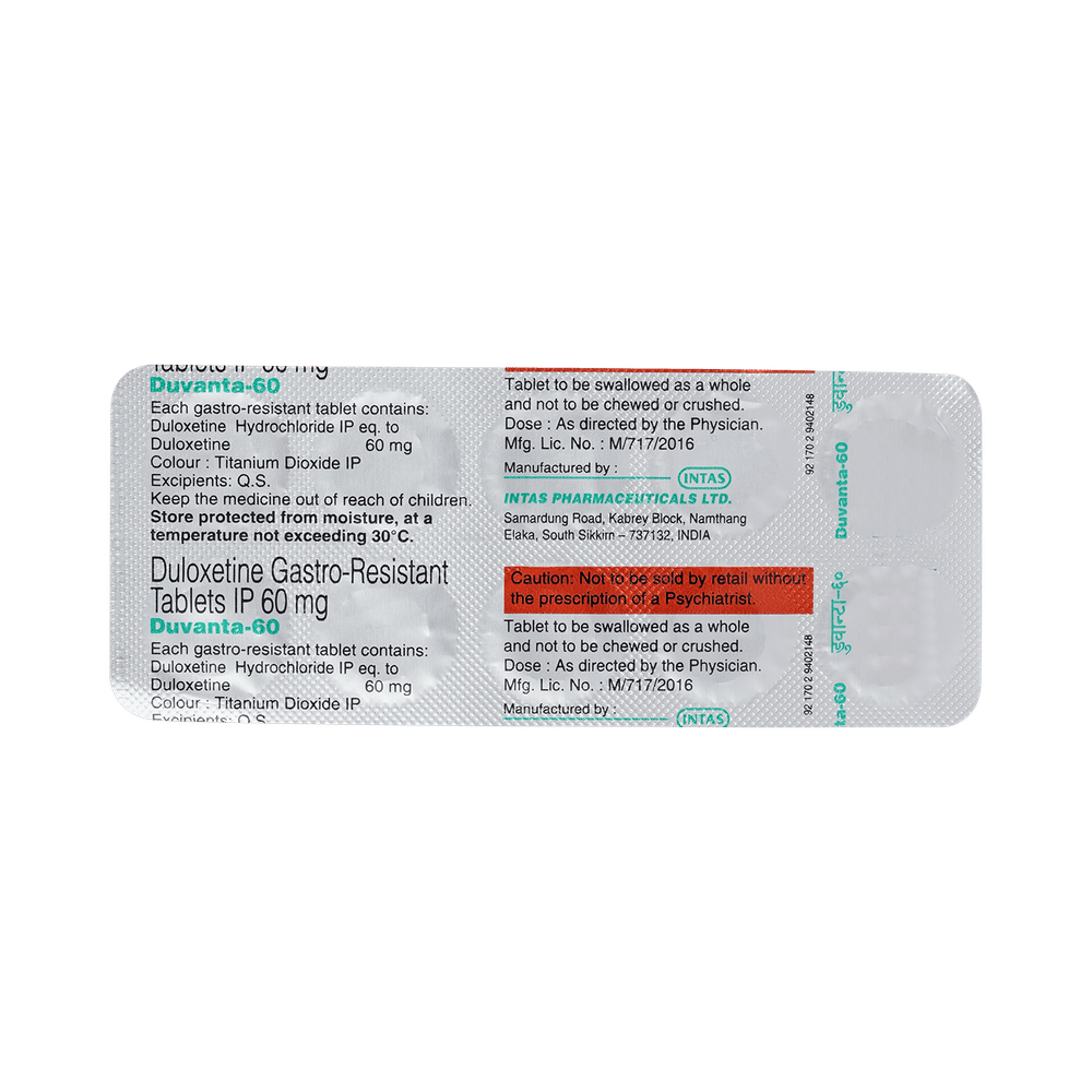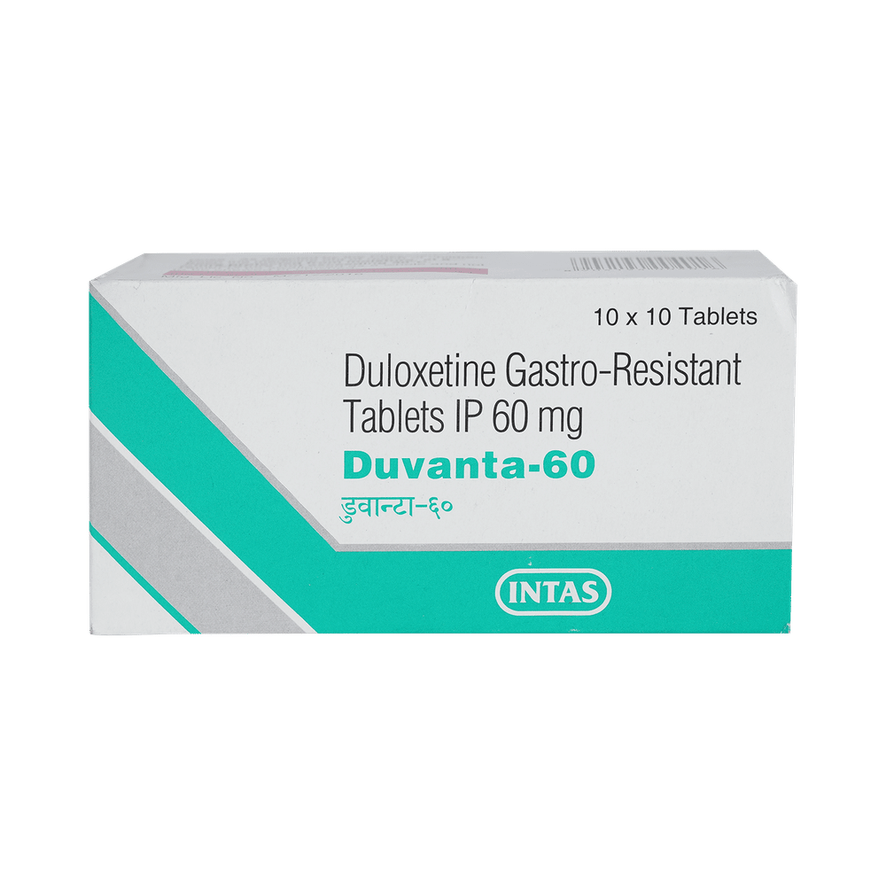 Duvanta 60 Tablet is used in the treatment of depression, anxiety disorder, diabetic nerve pain, fibromyalgia (a condition in which there are generalized pain and tenderness in the body), neuropathic pain, and stress urinary incontinence. Duvanta 60 Tablet works by increasing the level of chemical messengers (serotonin and noradrenaline) in the brain that have a calming effect on the brain and relax the nerves, thus treating your illness. It may be taken with or without food. It is advised to take this medicine at a fixed time each day to maintain a consistent level in the blood. If you miss any doses, take it as soon as you remember. Do not skip any doses and finish the full course of treatment even if you feel better. This medication mustn't be stopped suddenly as it may worsen your symptoms.Some common side effects of this medicine include nausea, headache, decreased libido, abnormal dreams, blurred vision, and dry mouth. It even causes dizziness and sleepiness, so do not drive or do anything that requires mental focus until you know how this medicine affects you. However, these side effects are temporary and usually resolve on their own in some time. Please consult your doctor if these do not subside or bother you.Before taking Duvanta 60 Tablet, inform your doctor if you have any problems with your kidneys, heart, liver, or have a history of seizures (epilepsy or fits). Inform your doctor if you develop any unusual changes in mood or behavior, new or worsening depression, or if you have any suicidal thoughts.