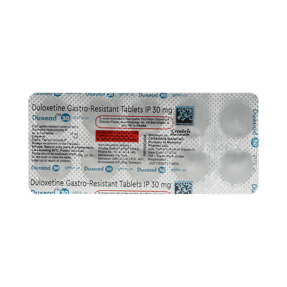 Duxead 30mg Tablet works by increasing the levels of chemical messengers (serotonin and noradrenaline), natural substances in the brain that help maintain mental balance and stop the movement of pain signals in the brain.