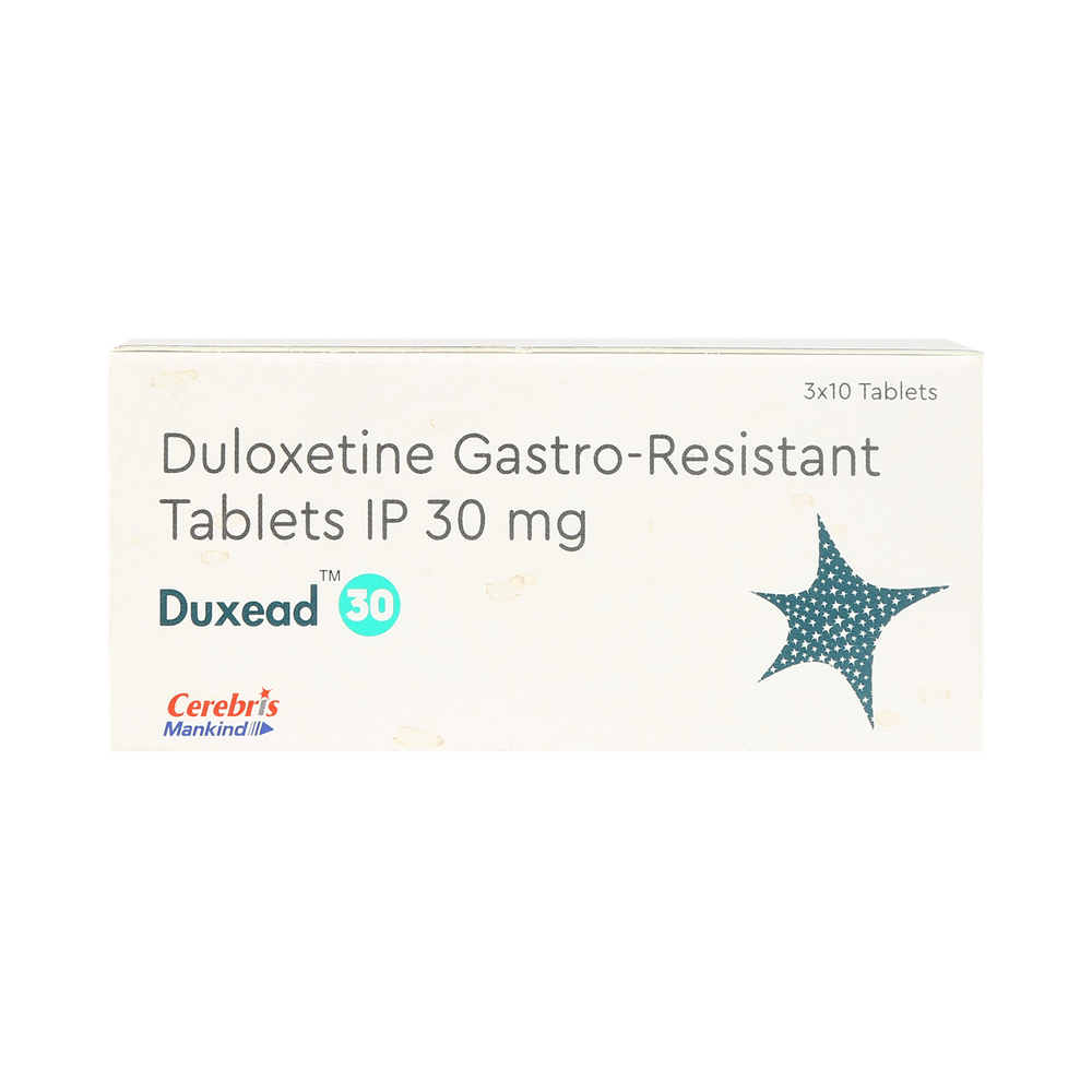 Duxead 30mg Tablet is used in the treatment of depression, anxiety disorder, diabetic nerve pain, fibromyalgia (a condition in which there are generalized pain and tenderness in the body), neuropathic pain, and stress urinary incontinence. Duxead 30mg Tablet works by increasing the level of chemical messengers (serotonin and noradrenaline) in the brain that have a calming effect on the brain and relax the nerves, thus treating your illness. It may be taken with or without food. It is advised to take this medicine at a fixed time each day to maintain a consistent level in the blood. If you miss any doses, take it as soon as you remember. Do not skip any doses and finish the full course of treatment even if you feel better. This medication mustn't be stopped suddenly as it may worsen your symptoms.Some common side effects of this medicine include nausea, headache, decreased libido, abnormal dreams, blurred vision, and dry mouth. It even causes dizziness and sleepiness, so do not drive or do anything that requires mental focus until you know how this medicine affects you. However, these side effects are temporary and usually resolve on their own in some time. Please consult your doctor if these do not subside or bother you.Before taking Duxead 30mg Tablet, inform your doctor if you have any problems with your kidneys, heart, liver, or have a history of seizures (epilepsy or fits). Inform your doctor if you develop any unusual changes in mood or behavior, new or worsening depression, or if you have any suicidal thoughts.