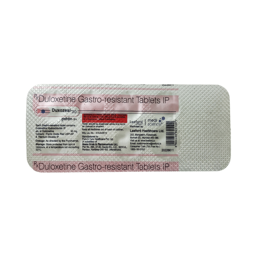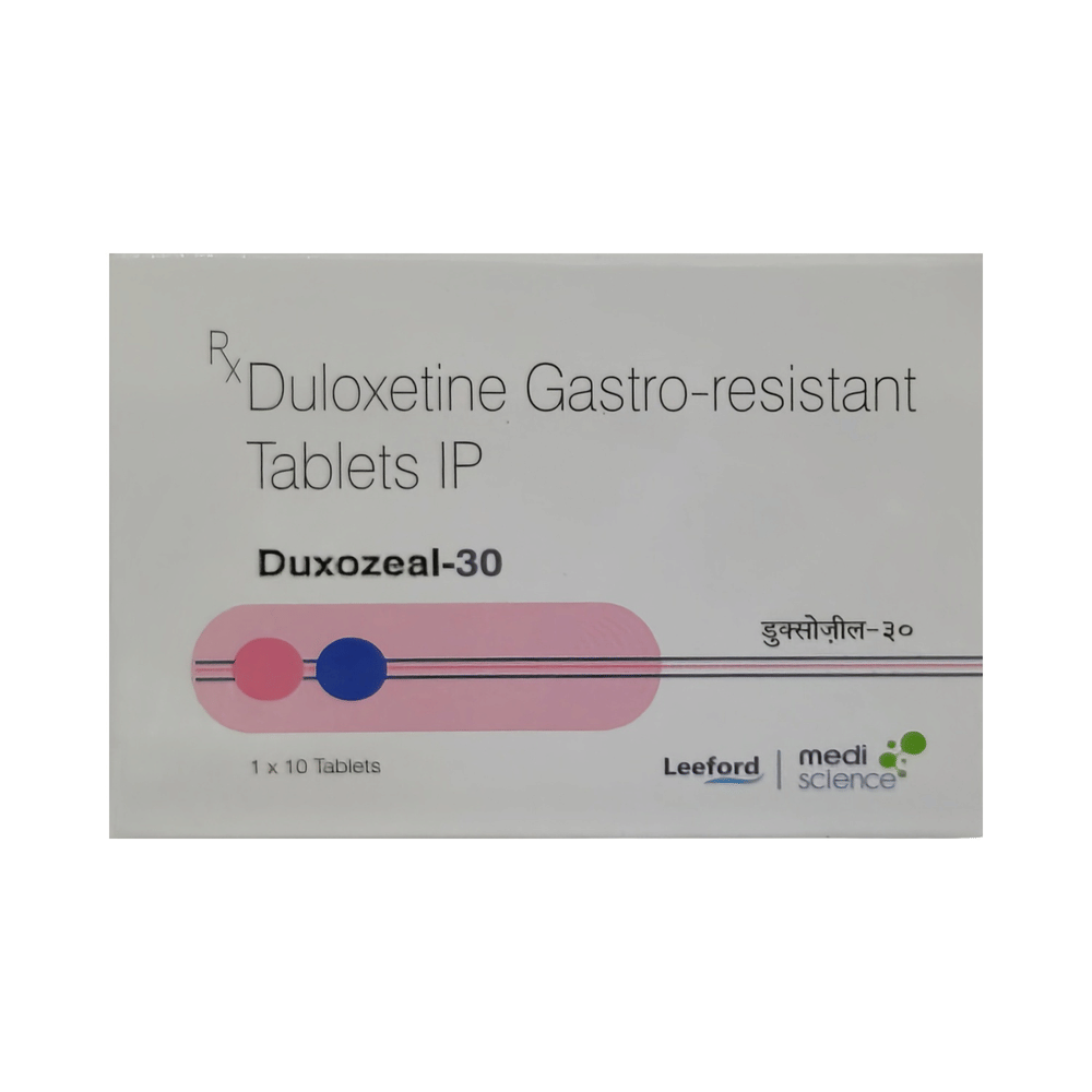 Duxozeal 30mg Tablet is used in the treatment of depression, anxiety disorder, diabetic nerve pain, fibromyalgia (a condition in which there are generalized pain and tenderness in the body), neuropathic pain, and stress urinary incontinence. Duxozeal 30mg Tablet works by increasing the level of chemical messengers (serotonin and noradrenaline) in the brain that have a calming effect on the brain and relax the nerves, thus treating your illness. It may be taken with or without food. It is advised to take this medicine at a fixed time each day to maintain a consistent level in the blood. If you miss any doses, take it as soon as you remember. Do not skip any doses and finish the full course of treatment even if you feel better. This medication mustn't be stopped suddenly as it may worsen your symptoms.Some common side effects of this medicine include nausea, headache, decreased libido, abnormal dreams, blurred vision, and dry mouth. It even causes dizziness and sleepiness, so do not drive or do anything that requires mental focus until you know how this medicine affects you. However, these side effects are temporary and usually resolve on their own in some time. Please consult your doctor if these do not subside or bother you.Before taking Duxozeal 30mg Tablet, inform your doctor if you have any problems with your kidneys, heart, liver, or have a history of seizures (epilepsy or fits). Inform your doctor if you develop any unusual changes in mood or behavior, new or worsening depression, or if you have any suicidal thoughts.