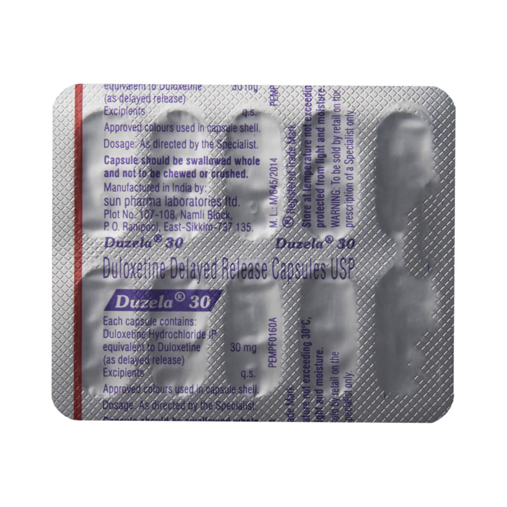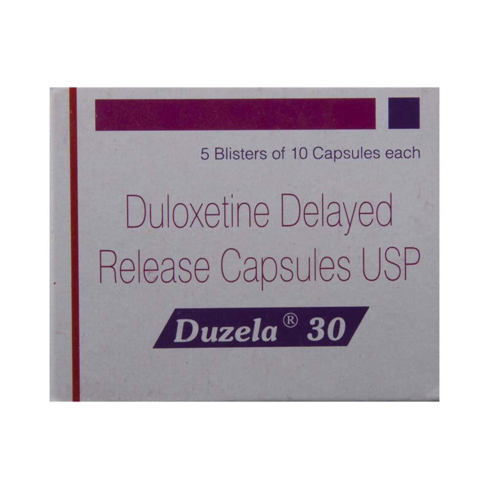 Duzela 30 Capsule DR is used in the treatment of depression, anxiety disorder, diabetic nerve pain, fibromyalgia (a condition in which there are generalized pain and tenderness in the body), neuropathic pain, and stress urinary incontinence. Duzela 30 Capsule DR works by increasing the level of chemical messengers (serotonin and noradrenaline) in the brain that have a calming effect on the brain and relax the nerves, thus treating your illness. It may be taken with or without food. It is advised to take this medicine at a fixed time each day to maintain a consistent level in the blood. If you miss any doses, take it as soon as you remember. Do not skip any doses and finish the full course of treatment even if you feel better. This medication mustn't be stopped suddenly as it may worsen your symptoms.Some common side effects of this medicine include nausea, headache, decreased libido, abnormal dreams, blurred vision, and dry mouth. It even causes dizziness and sleepiness, so do not drive or do anything that requires mental focus until you know how this medicine affects you. However, these side effects are temporary and usually resolve on their own in some time. Please consult your doctor if these do not subside or bother you.Before taking Duzela 30 Capsule DR, inform your doctor if you have any problems with your kidneys, heart, liver, or have a history of seizures (epilepsy or fits). Inform your doctor if you develop any unusual changes in mood or behavior, new or worsening depression, or if you have any suicidal thoughts.