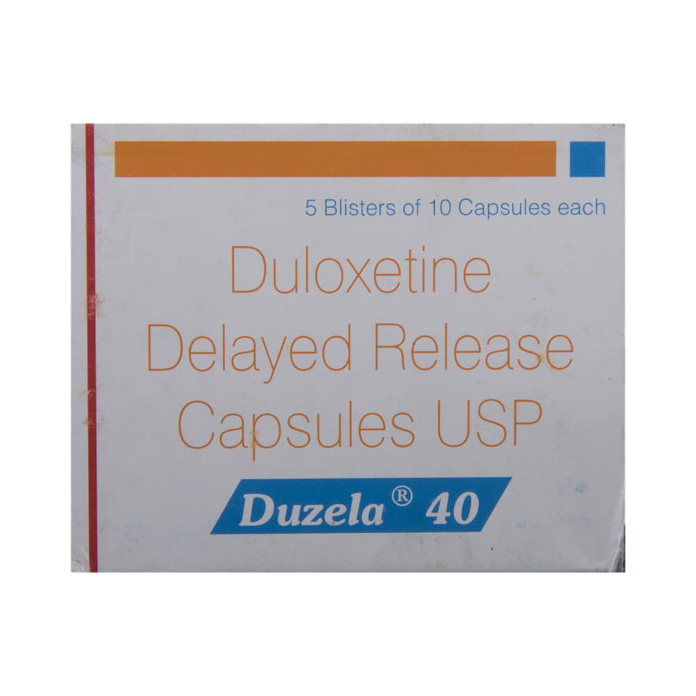 Duzela 40 Capsule DR is used in the treatment of depression, anxiety disorder, diabetic nerve pain, fibromyalgia (a condition in which there are generalized pain and tenderness in the body), neuropathic pain, and stress urinary incontinence. Duzela 40 Capsule DR works by increasing the level of chemical messengers (serotonin and noradrenaline) in the brain that have a calming effect on the brain and relax the nerves, thus treating your illness. It may be taken with or without food. It is advised to take this medicine at a fixed time each day to maintain a consistent level in the blood. If you miss any doses, take it as soon as you remember. Do not skip any doses and finish the full course of treatment even if you feel better. This medication mustn't be stopped suddenly as it may worsen your symptoms.Some common side effects of this medicine include nausea, headache, decreased libido, abnormal dreams, blurred vision, and dry mouth. It even causes dizziness and sleepiness, so do not drive or do anything that requires mental focus until you know how this medicine affects you. However, these side effects are temporary and usually resolve on their own in some time. Please consult your doctor if these do not subside or bother you.Before taking Duzela 40 Capsule DR, inform your doctor if you have any problems with your kidneys, heart, liver, or have a history of seizures (epilepsy or fits). Inform your doctor if you develop any unusual changes in mood or behavior, new or worsening depression, or if you have any suicidal thoughts.