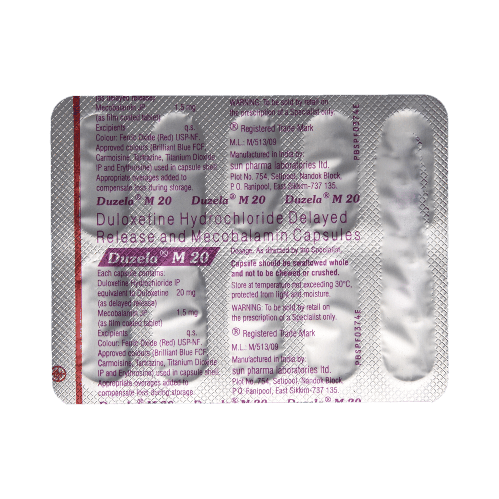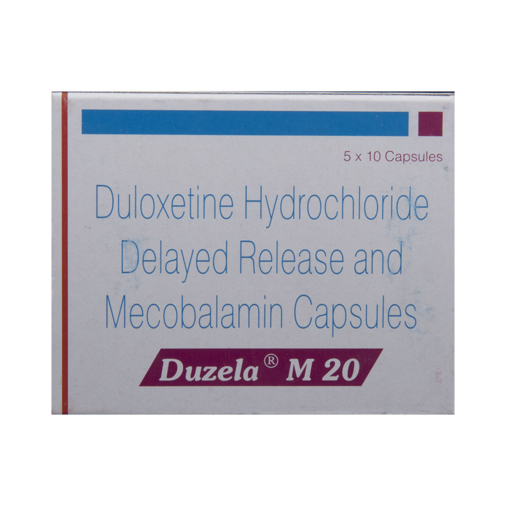 Duzela M 20 Capsule DR is a combination of two medicines used to treat neuropathic pain. It works by protecting the nerve fibres against damage, repairing the damaged nerves. This way it effectively relieves the pain sensation and also elevates the mood. Duzela M 20 Capsule DR may be taken with or without food. However, it is advised to take it at the same time each day as this helps to maintain a consistent level of medicine in the body. Take this medicine in the dose and duration advised by your doctor. If you miss a dose of this medicine, take it as soon as you remember. Finish the full course of the treatment even if you feel better. It is important not to stop taking this medicine suddenly.Some common side effects of this medicine include nausea, constipation, headache, insomnia (difficulty in sleeping), ejaculation disorder, erectile dysfunction, and low sexual desire. However, these are temporary and usually resolve on their own. Please consult your doctor if these do not subside or bother you.You should avoid alcohol while taking Duzela M 20 Capsule DR, as it may worsen certain side effects. This medicine can also lead to weight gain, eat a healthy balanced diet, avoid snacking with high-calorie food, and exercise regularly. Inform your doctor if you develop any unusual changes in mood or behavior, new or worsening depression, or suicidal thoughts or behavior.