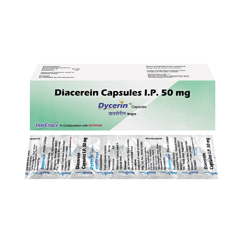 Dycerin Capsule is used in the treatment of osteoarthritis. It lowers pain and swelling and helps the stiff joints to heal quickly. It may be used alone or in combination with other medicines. Dycerin Capsule is to be taken with food. Take it regularly and at a fixed time each day. It may take few weeks for the medicine to work. Along with taking the medicine, exercise regularly to strengthen muscles around the affected joint and manage your weight. Do not stop taking the medicine suddenly without talking to your doctor.It may cause few common side effects such as diarrhea or discoloration of urine. Regular monitoring of blood sugar level, especially in diabetic patient, is important as it may increase your blood sugar level.
