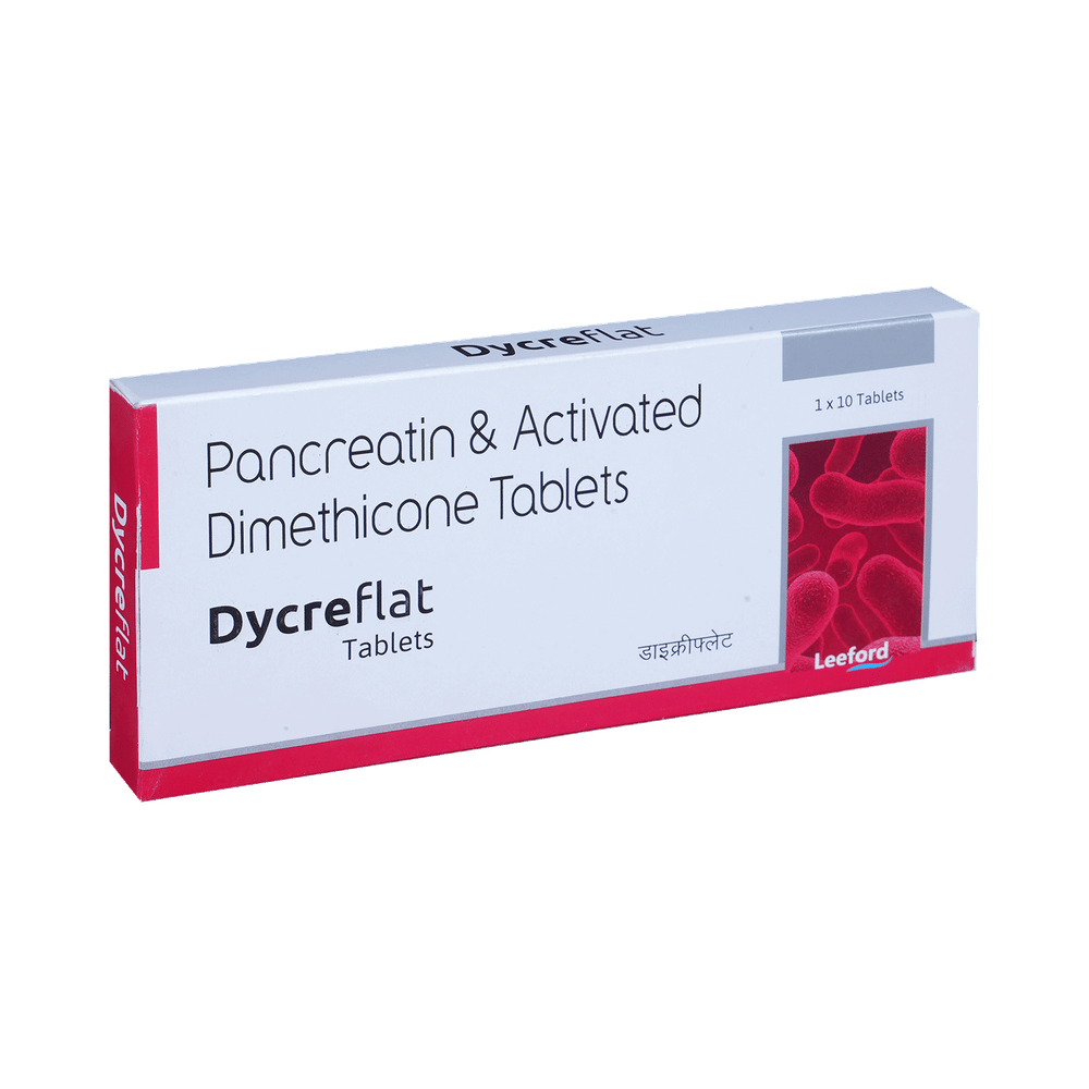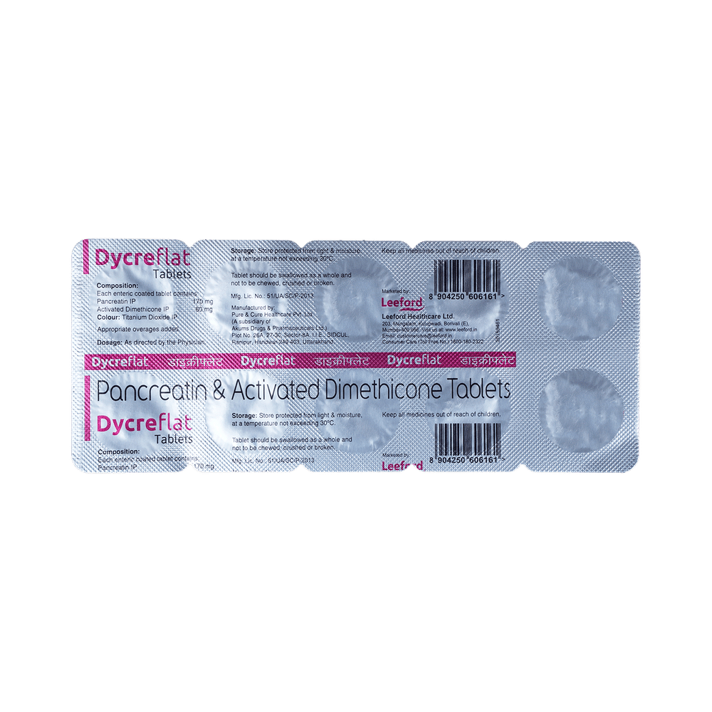 Dycreflat 170mg/80mg Tablet is a combination of two medicines: Pancreatin and Dimethicone. Pancreatin is a digestive enzyme that helps in digestion of food. Dimethicone is an antifoaming medicine which disintegrates gas bubbles and allows easy passage of gas.