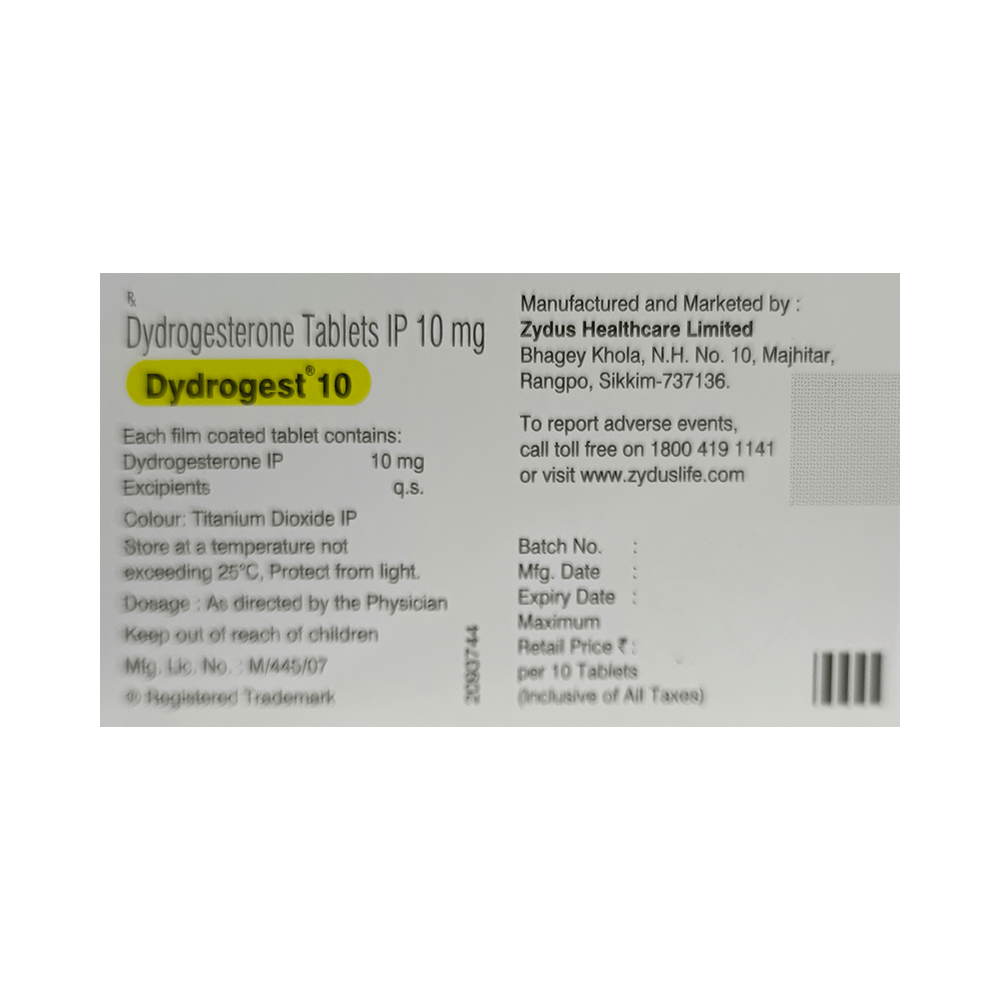 In Treatment of Female infertilityDydrogest 10 Tablet aids in infertility by preparing the womb lining for pregnancy. It also helps in the regulation of the menstrual period and the prevention of repeated miscarriages. Dydrogest 10 Tablet can increase the chances of a successful pregnancy in women who have a history of recurrent abortions.In Treatment of Pain during menstruationDydrogest 10 Tablet gives relief from abdominal pain and cramps during a menstrual period. A painful period can have a major impact on your life, try to take rest, reduce stress and drink plenty of warm fluids to ease discomfort. In Treatment of Premenstrual syndrome (PMS)Premenstrual syndrome is a combination of physical and emotional disturbances that occurs when a woman’s menstruation comes to an end. Dydrogest 10 Tablet helps ease the symptoms of PMS such as bloating, swelling, tiredness, mood swings. Dydrogest 10 Tablet also relieves pain, cramp, and headaches associated with PMS. Altogether, this medicine will help ease discomforts and improve your mood. Lifestyle changes such as regular exercise, yoga, a healthy diet, and getting plenty of sleep may also be helpful.In Treatment of EndometriosisEndometriosis is a condition where tissue similar to endometrial tissue (tissue that lines the inside of the uterus) grows outside the uterus. The main symptoms include pain in your lower stomach or back, period pain, pain during and after sex, constipation, diarrhea, and difficulty in conceiving. Dydrogest 10 Tablet prevents the growth of the endometrial tissue outside the uterus and thus helps relieve the symptoms you may have.In Treatment of Abnormal uterine bleedingDydrogest 10 Tablet slows the growth of the lining of the womb before menstruation. By regulating and balancing the menstrual cycle it helps to reduce heavy or prolonged bleeding, improve regularity, and restore hormonal balance in the uterus.In Prevention of MiscarriageDydrogest 10 Tablet helps to prevent miscarriage in such women who have had such complications in an earlier pregnancy. It improves the thickness of the lining of the uterus (womb) and also attachment of the baby to the uterus. This makes sure that there are no abnormal contractions of the uterus which may lead to premature delivery.Dydrogest 10 Tablet helps prevent threatened miscarriage by supporting the hormonal environment necessary for maintaining a pregnancy. It has progesterone-like effects and helps to provide hormonal support to the uterus, ensuring a favorable environment for the implantation and development of the embryo. It stabilises the uterine lining and promoting proper growth of the pregnancy. This way Dydrogest 10 Tablet can help reduce the risk of miscarriage in cases of threatened miscarriage.In Hormone replacement therapyDydrogest 10 Tablet helps in protecting the uterus, relieving menopausal symptoms, regulating menstrual cycles, preventing estrogen-related complications, and supporting fertility treatments. However it may not treat all your symptoms, consult with your doctor. You should use this medicine as it is prescribed, and for as long as it is prescribed by your doctor.show moreshow less