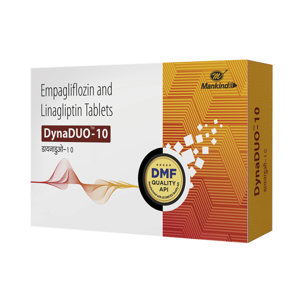 DynaDuo 10 Tablet is a combination of two antidiabetic medicines: Empagliflozin and Linagliptin. Empagliflozin works by removing excess glucose from your body through urine. Linagliptin works by lowering glucose production in the liver, delaying glucose absorption from intestines and increasing the body's sensitivity to insulin.