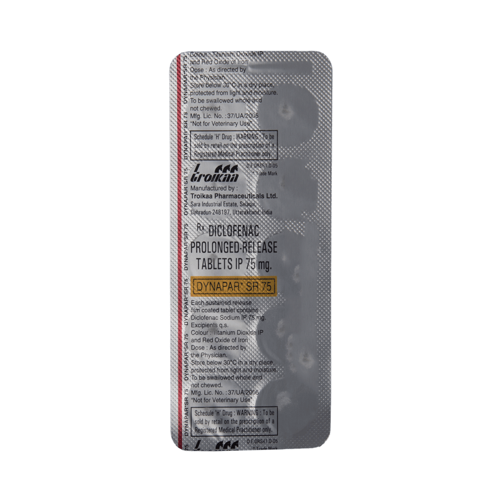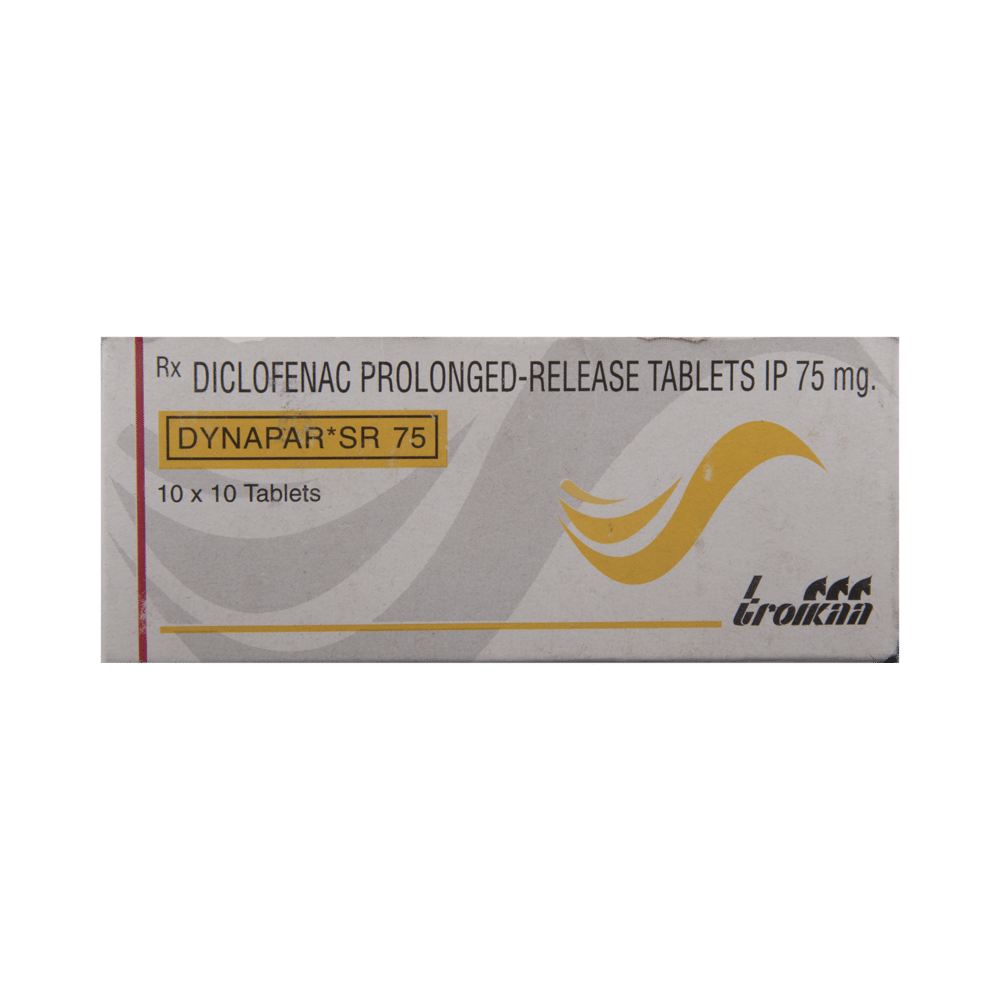 Dynapar SR 75 Tablet is a pain-relieving medicine. It is used to treat pain, swelling, stiffness, and joint pain in conditions like rheumatoid arthritis, osteoarthritis, and acute musculoskeletal injuries. It is commonly used in back pain, shoulder pain, neck pain, sprains, and spasms. Dynapar SR 75 Tablet should be taken in the dose and duration as advised by your doctor. It should be taken with food or milk to prevent stomach upset. Inform your doctor if you have any history of heart disease or stroke.The most common side effects of this medicine include nausea, vomiting, diarrhea, abdominal pain, indigestion, flatulence, decreased appetite, headache, and dizziness. Your doctor may also regularly monitor your kidney function, liver function, and levels of blood components if you are taking this medicine for long-term treatment. Long-term use may lead to serious complications such as stomach bleeding and kidney problems.Dynapar SR 75 Tablet should be used with precaution in patients with asthma and cardiovascular bleeding. This medicine is contraindicated for the treatment of perioperative pain in the setting of coronary artery bypass graft (CABG) surgery. Pregnant and breastfeeding women should consult their doctors before using this medicine as it may cause harmful effects to the developing baby.