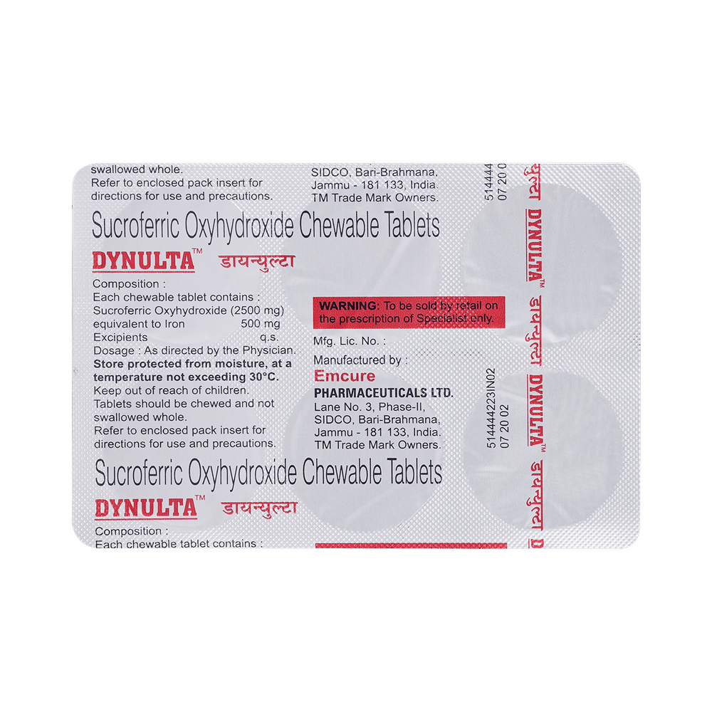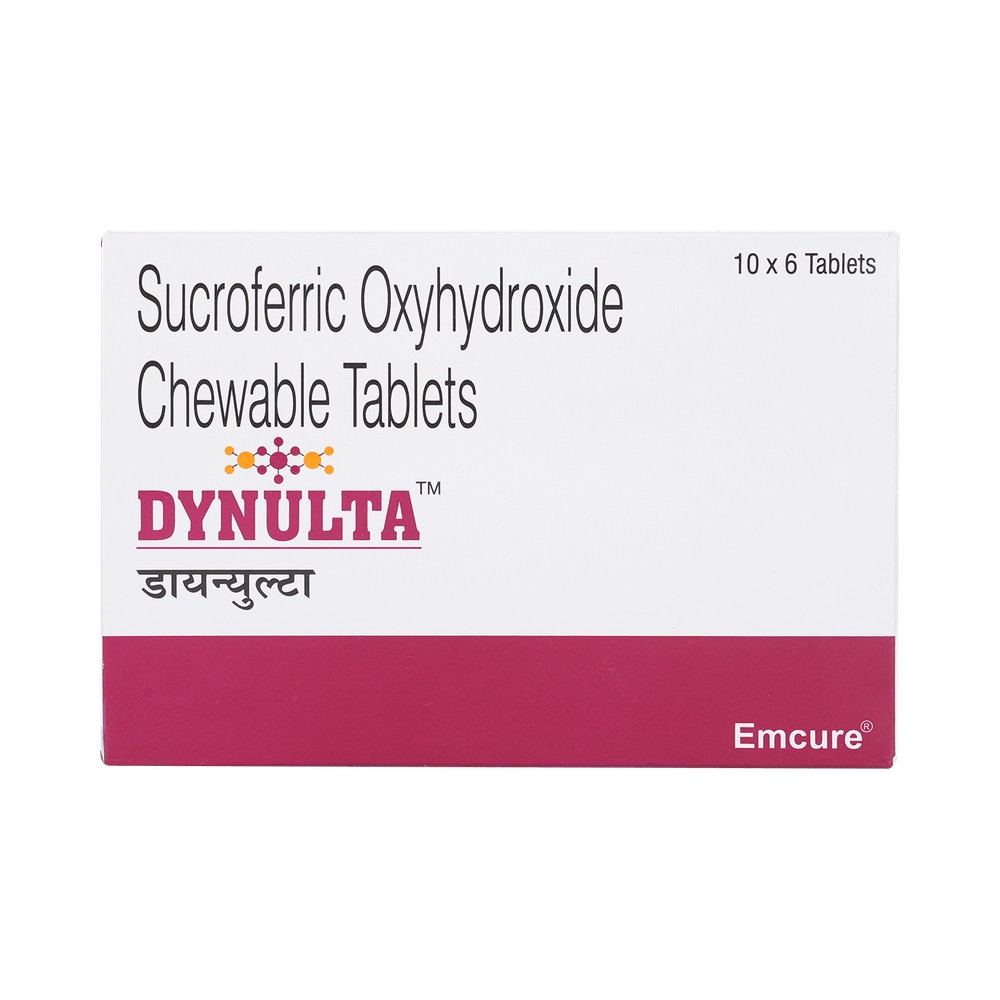 Dynulta Tablet contains Sucroferric Oxyhydroxide, an iron-based, calcium-free phosphate binder that binds to the dietary phosphate in the gastrointestinal tract (GIT) and prevents its uptake into the blood, when taken with meals.This way, it helps treat high phosphate levels in the blood.