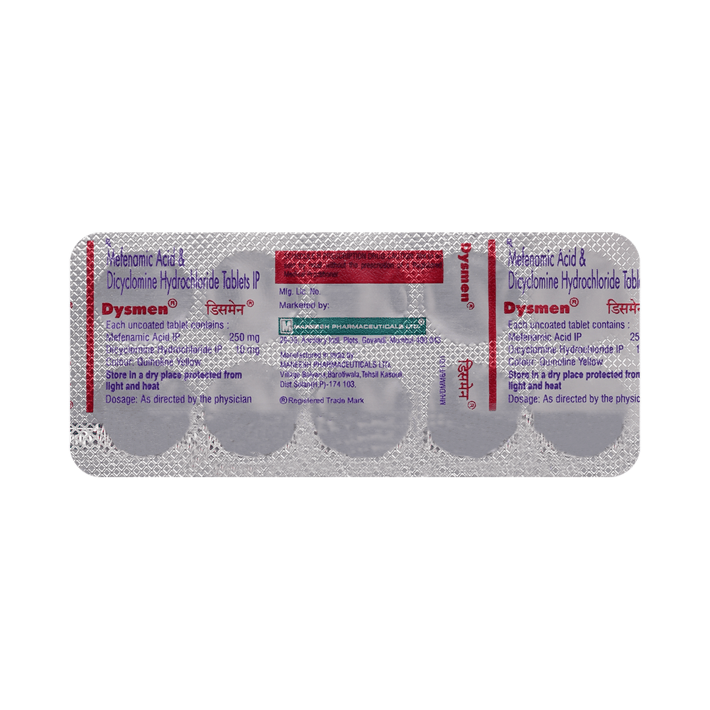 Dysmen Tablet is a prescription medicine that helps to provide symptomatic relief from menstrual (period-related) pain and cramps. It is also used to treat abdominal pain by relieving spasms of the muscles in the stomach and intestines. Dysmen Tablet should be taken with food. This will prevent you from getting an upset stomach. The dose and duration will depend on what you are using it for and how well it helps your symptoms. Use it regularly and do not discontinue using it until the doctor tells you.It may cause some common side effects like dizziness, dryness in the mouth, blurred vision, nausea, diarrhea, headache, and sleepiness. If you experience any of such side effects that do not go away or get worse, you should let your doctor know. Your doctor may be able to suggest ways of preventing or reducing the side effects. In general, you should try to use the smallest amount necessary to control your symptoms.Before using the medicine, you should tell your doctor if you have any kidney or liver problems, or if you are taking any other medicines. Pregnant and breastfeeding women should also consult their doctors before using the medicine.