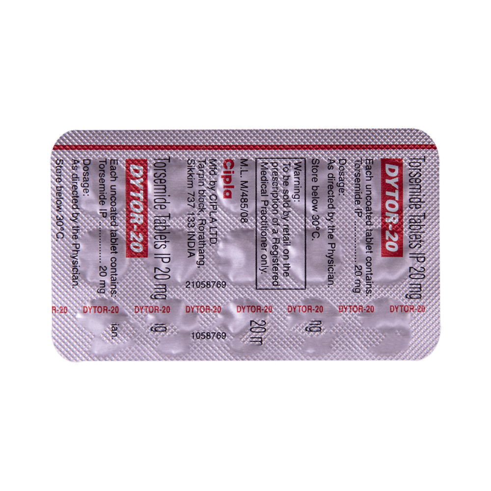 DYtor 20 Tablet belongs to a group of medicines called diuretics or water tablets. It is used to reduce the swelling (edema) caused by too much water in the body in people who have heart failure, liver disease, or kidney disease. This medicine is also used to treat high blood pressure. DYtor 20 Tablet helps your body get rid of extra water and salt through urine. It may be used alone or in combination with other medicines as per the dose advised by your doctor. It can be taken with or without food and should be taken at the same time each day. It is best to avoid taking this medicine within 4 hours of your bedtime to prevent having to get up at night to urinate.It is important to continue taking this medication even if you feel well. If you stop taking it without consulting your doctor, your condition may worsen. Lifestyle changes like reducing stress, restricting salt intake, and stopping smoking may help this medication work better.Common side effects of this medicine include headache, dizziness, dehydration, decreased blood pressure, and stomach upset. These are usually mild and disappear after a short time. Consult your doctor if they bother you or do not go away.Before taking this medicine, let your doctor know if you have any liver problems. Pregnant or breastfeeding women should also consult their doctor before taking it. Regular monitoring of kidney function and electrolyte levels is important while using this medicine. It may reduce the potassium level in your blood so your doctor may ask you to add potassium-rich foods to your diet (such as bananas, coconut water, etc.) or prescribe supplements.