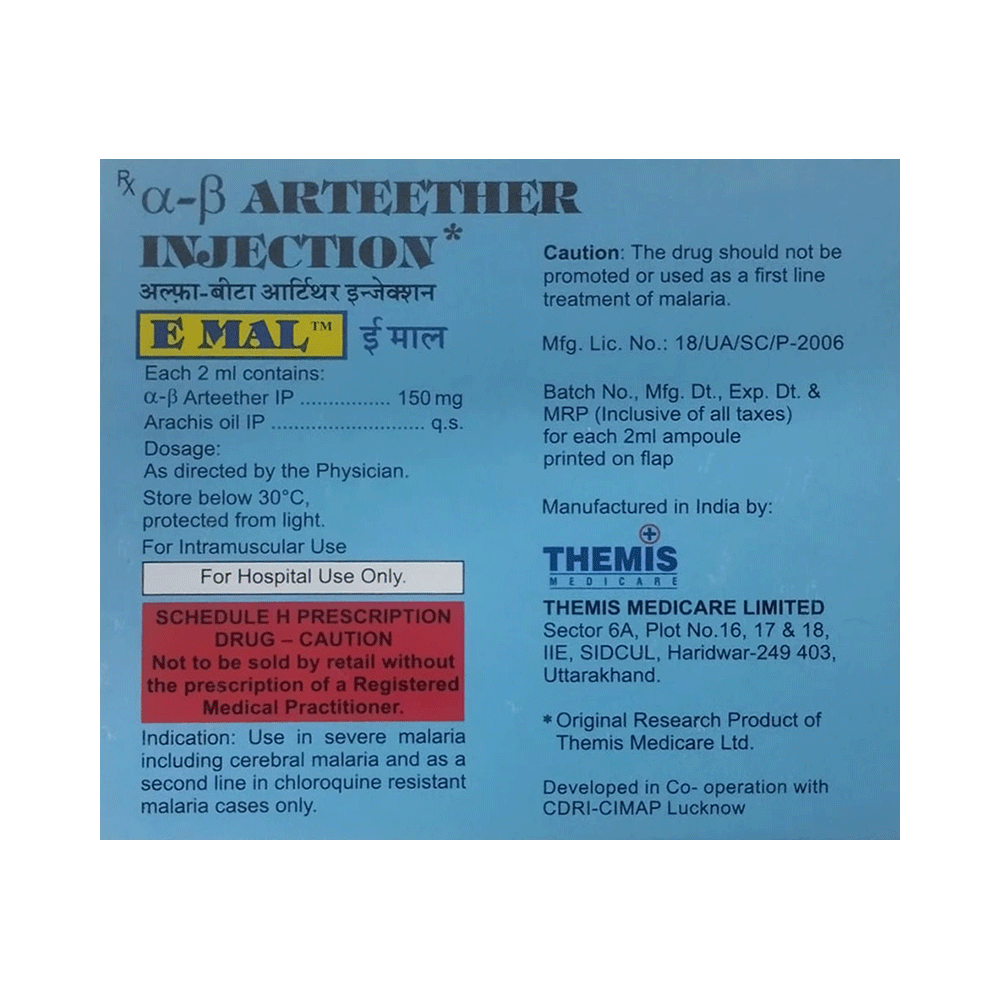 E Mal Injection (2ml Each) is an antiparasitic medication. It is used in the treatment of malaria. It is not used to prevent malaria or to treat severe malaria (where it has affected the brain, lungs, or kidneys). E Mal Injection (2ml Each) is administered as an injection under the supervision of a doctor or a nurse and should not be self-administered.Some people may experience vomiting, headache, nausea, and abdominal pain as side effects of this medicine. You may also notice some injection site reactions like pain, swelling, or redness. Please consult your doctor if these side effects persist.