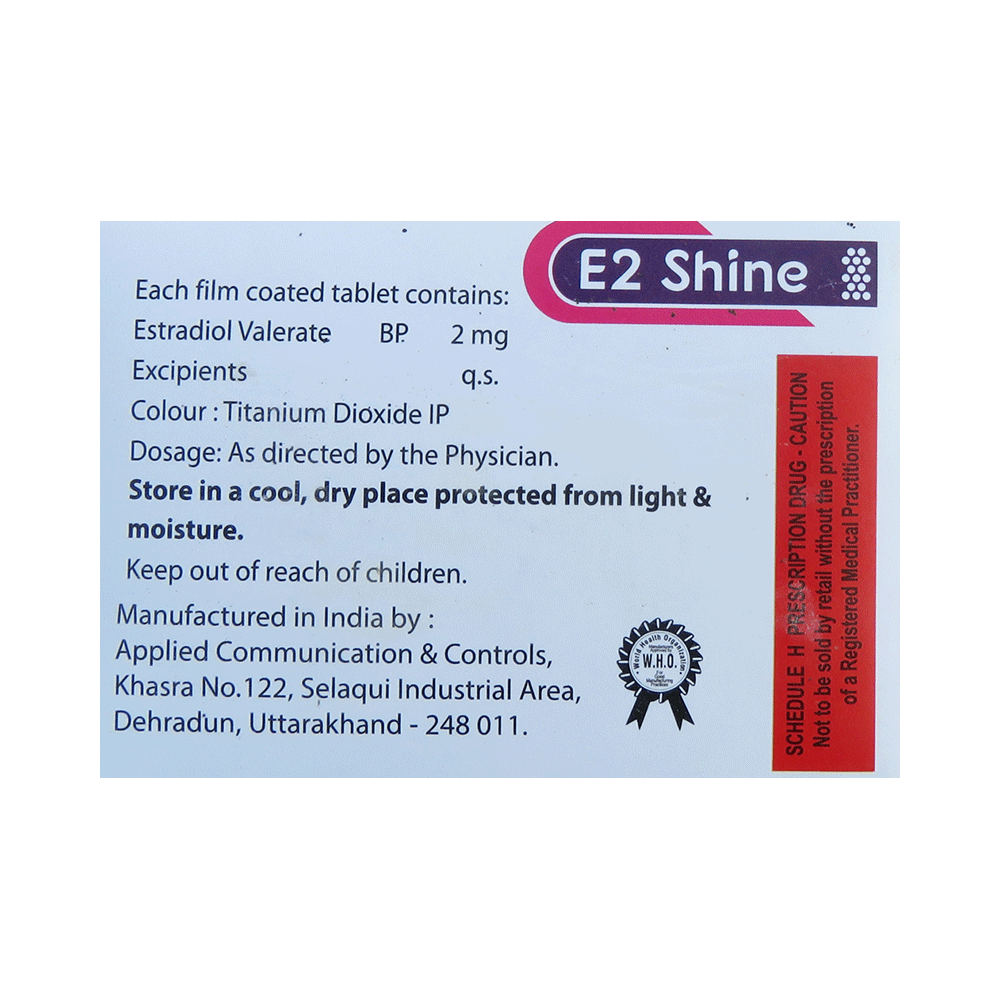 E2 Shine Tablet is a female sex hormone (estrogen). This is a type of hormone replacement therapy (HRT) that is used to treat symptoms associated with menopause (hot flushes, vaginal dryness, and itching), estrogen deficiency, and thinning of bones (osteoporosis). E2 Shine Tablet is to be swallowed with water. It can be taken with or without food, but remember to take it at a fixed time each day for better efficacy. The dose and duration will be decided by your doctor so that you get the right amount to control your symptoms. If you have missed a dose, take it as soon as you remember it. Do not skip any dose and finish the full course of treatment. The treatment should not be stopped abruptly without consulting your doctor as this may affect the potency of this medicine.The most common side effects of this HRT are headaches, breast pain, irregular vaginal bleeding or spotting, abdominal cramps or bloating, nausea, vomiting, and hair loss. Some of the warning signs and symptoms that need immediate medical attention are breast lumps, unusual vaginal bleeding, dizziness and faintness, severe headaches, chest pain, shortness of breath, pains in your legs, etc.Before taking this medicine, it is important to tell your doctor if you are taking or have recently taken any other medicines for the same disease or other diseases. Before you initiate with this HRT, you must consult the doctor if you have a history of unexplained vaginal bleeding or if you have ever had a blood clot in your legs or your lungs. If you are pregnant or breastfeeding, you should tell your doctor before taking this medicine. Your doctor may suggest you some diagnostic or laboratory tests to know the effects and side effects of this medicine on your body.