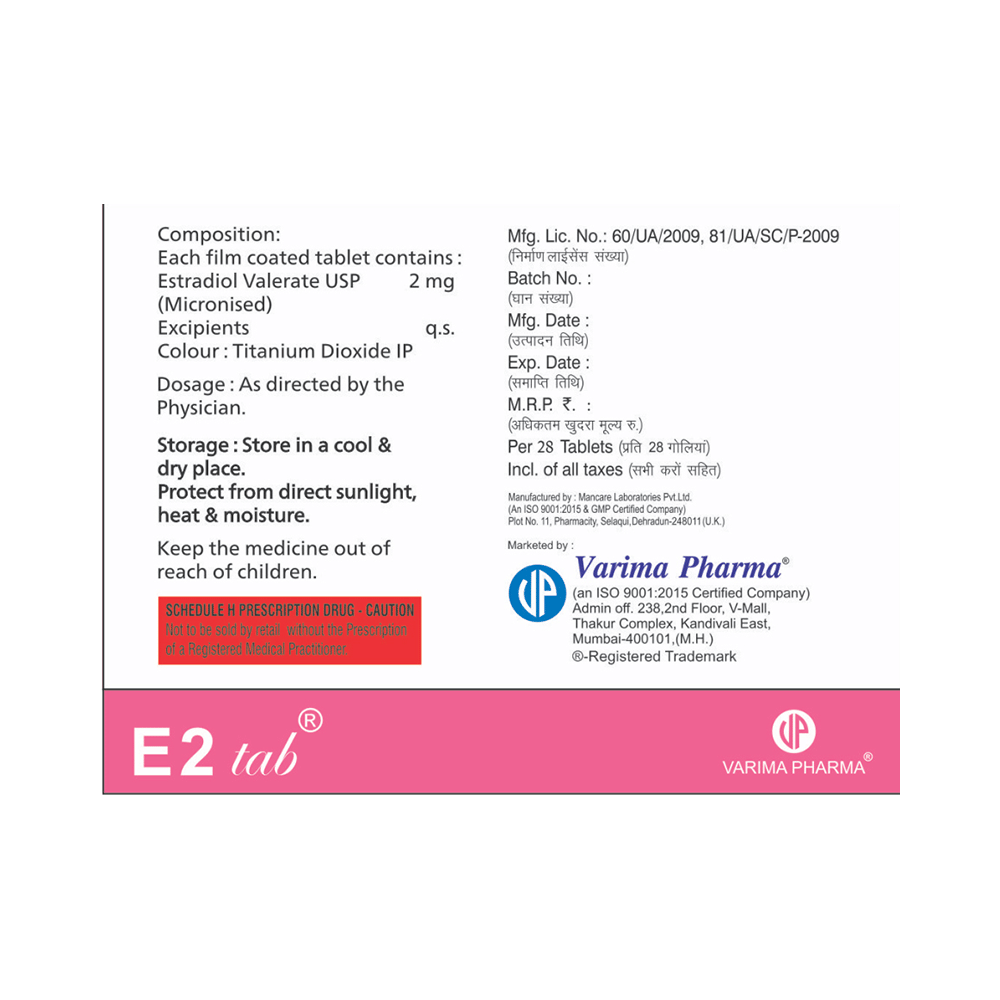 E2 Tablet is a female sex hormone (estrogen). This is a type of hormone replacement therapy (HRT) that is used to treat symptoms associated with menopause (hot flushes, vaginal dryness, and itching), estrogen deficiency, and thinning of bones (osteoporosis). E2 Tablet is to be swallowed with water. It can be taken with or without food, but remember to take it at a fixed time each day for better efficacy. The dose and duration will be decided by your doctor so that you get the right amount to control your symptoms. If you have missed a dose, take it as soon as you remember it. Do not skip any dose and finish the full course of treatment. The treatment should not be stopped abruptly without consulting your doctor as this may affect the potency of this medicine.The most common side effects of this HRT are headaches, breast pain, irregular vaginal bleeding or spotting, abdominal cramps or bloating, nausea, vomiting, and hair loss. Some of the warning signs and symptoms that need immediate medical attention are breast lumps, unusual vaginal bleeding, dizziness and faintness, severe headaches, chest pain, shortness of breath, pains in your legs, etc.Before taking this medicine, it is important to tell your doctor if you are taking or have recently taken any other medicines for the same disease or other diseases. Before you initiate with this HRT, you must consult the doctor if you have a history of unexplained vaginal bleeding or if you have ever had a blood clot in your legs or your lungs. If you are pregnant or breastfeeding, you should tell your doctor before taking this medicine. Your doctor may suggest you some diagnostic or laboratory tests to know the effects and side effects of this medicine on your body.