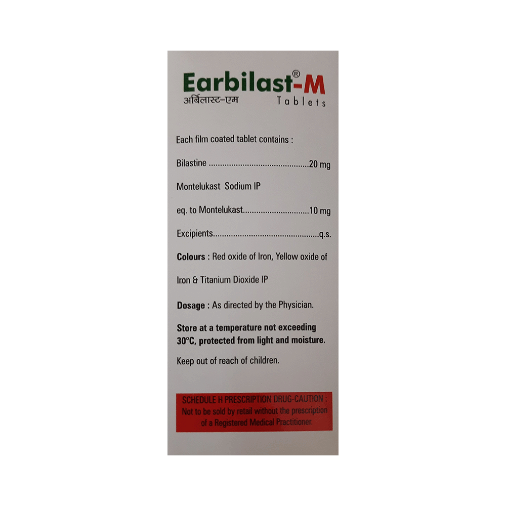 In Treatment of Allergic conditionsEarbilast-M Tablet provides relief from allergic symptoms such as blocked or runny nose, sneezing and itchy or watery eyes caused by seasonal hay fever (allergic rhinitis), seasonal allergies, and allergies. It works by reducing certain substances in the body that are responsible for the allergic symptoms. Earbilast-M Tablet reduces swelling in the airways and gives relief from the symptoms of asthma. In Treatment of Allergic rhinitisEarbilast-M Tablet provides relief from allergic symptoms such as blocked or runny nose, sneezing, and itchy or watery eyes caused by seasonal hay fever (allergic rhinitis), seasonal allergies, and other allergies. It works by reducing certain substances in the body that are responsible for the allergic symptoms. Earbilast-M Tablet reduces swelling in the airways and gives relief from allergic reactions.show moreshow less