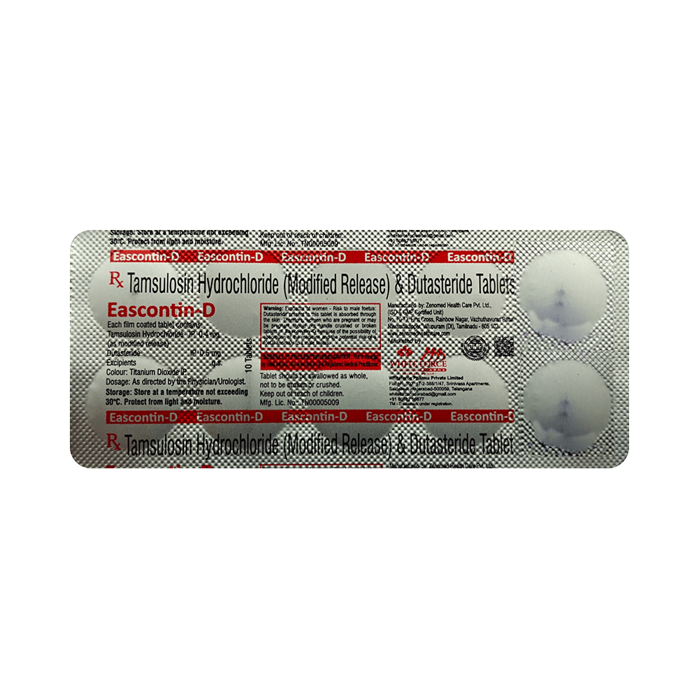In Treatment of Benign prostatic hyperplasiaWhen your prostate gland becomes enlarged it can cause urinary problems such as difficulty passing urine and a need to go to the toilet frequently or urgently. It can also cause urine flow to be slower. If not treated, there is a risk that your urine flow will be completely blocked. Eascontin-D Tablet MR is a combination of two medicines: dutasteride and tamsulosin. Dutasteride reduces the size of your prostate by blocking the production of a hormone which causes it to grow. Tamsulosin works by relaxing muscles in the bladder and prostate. Together they can rapidly relieve the symptoms and make it easier for you to urinate. However, it may take up to 6 months to notice the full benefit. Take this medicine exactly as prescribed for maximum benefits.