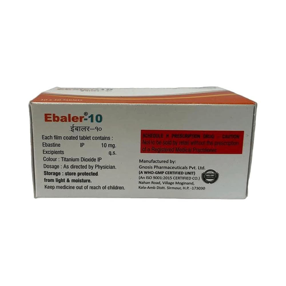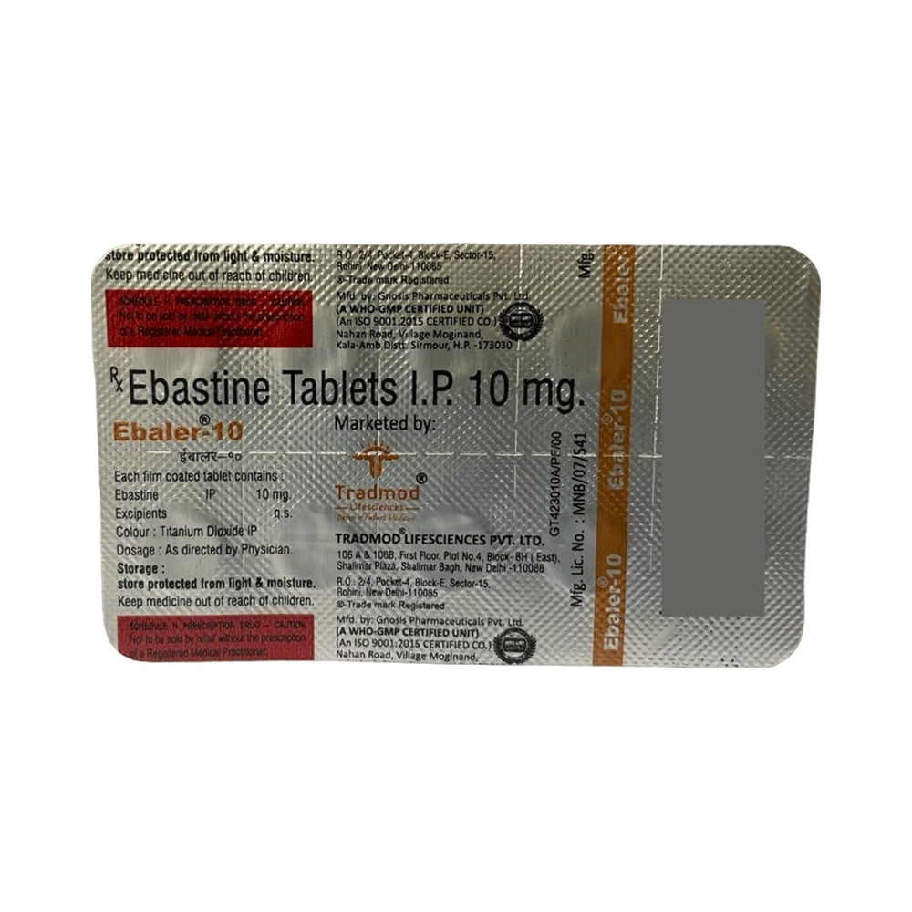 Ebaler 10 Tablet is an antihistaminic medication. It treats allergy symptoms such as itching, swelling, and rashes by blocking the effects of a chemical messenger (histamine) in the body.
