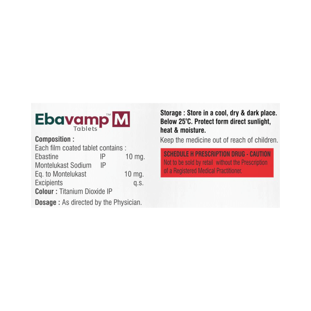 Ebavamp M Tablet is a combination of two medicines: Ebastine and Montelukast, which treats sneezing and runny nose caused due to allergies. Ebastine is an antiallergic which blocks the action a chemical messenger (histamine) responsible for runny nose, watery eyes and sneezing. Montelukast is a leukotriene antagonist. It works by blocking the action of another chemical messenger (leukotriene). This reduces inflammation (swelling) in the airways and nose, and improves symptoms.