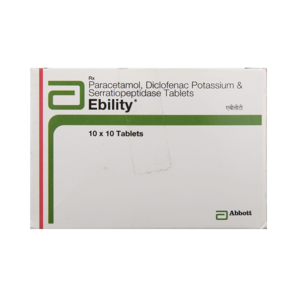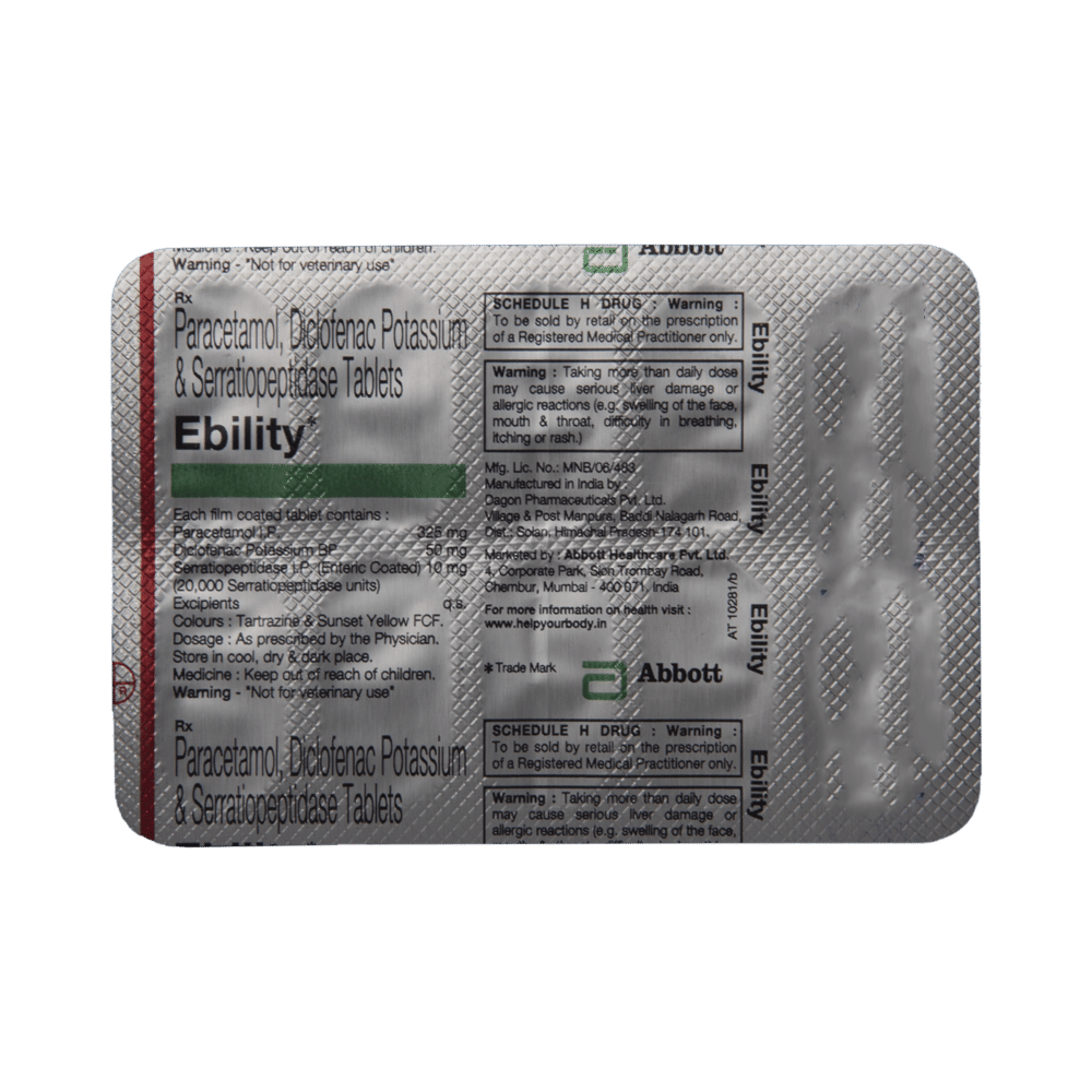 Ebility Tablet is a combination of three medicines: Diclofenac, Paracetamol and Serratiopeptidase, which relieves pain. Diclofenac is a non-steroidal anti-inflammatory drug (NSAID) and Paracetamol is an antipyretic (fever reducer). They work by blocking the release of certain chemical messengers in the brain that cause pain and fever. Serratiopeptidase is an enzyme which works by breaking down abnormal proteins at the site of inflammation, and promotes healing.