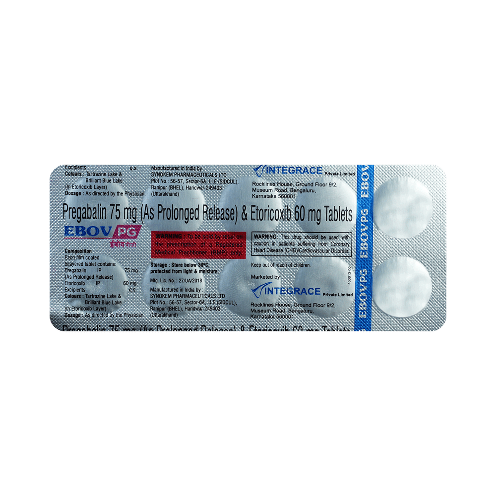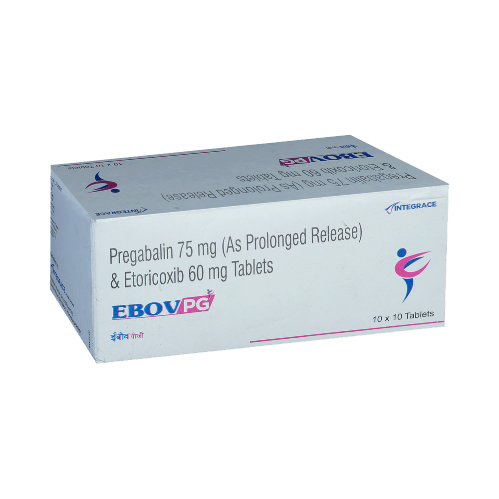 Ebov PG 75mg/60mg Tablet is a combination of two medicines: Pregabalin and Etoricoxib. Pregabalin is an antiepileptic medication and belives to block pain by interfering with pain signals traveling through the damaged nerves and the brain. Etoricoxib is a non-steroidal anti-inflammatory drug (NSAID) called COX-2 inhibitors. It works by blocking the release of certain chemical messengers that are responsible for pain and inflammation (redness and swelling).