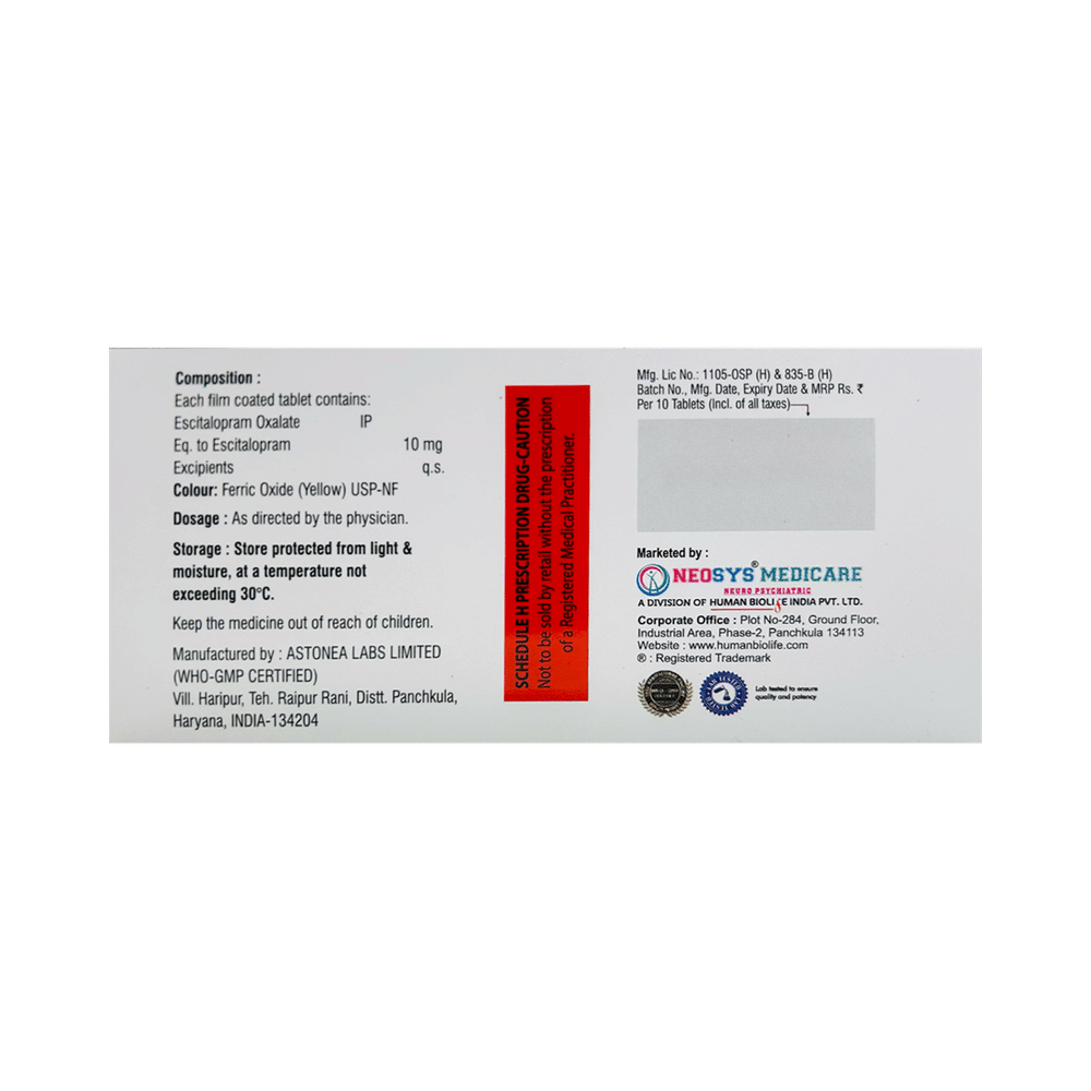 Salt Composition: Escitalopram Oxalate (10mg)