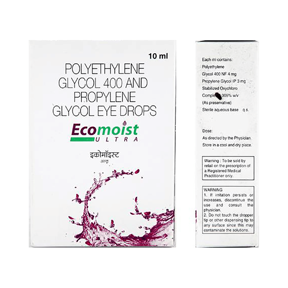 ECOmoist Ultra Eye Drop is a combination of two lubricating medicines: Polyethylene Glycol and Propylene Glycol, which treats dry eyes. They work similar to natural tears and provide temporary relief from burning and discomfort due to dryness of the eye.