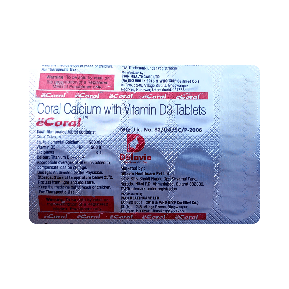 Ecoral Tablet is a nutritional supplement used in the treatment of calcium deficiency. It is prescribed when your diet alone cannot provide the necessary calcium your body needs. It increases the absorption of calcium and helps prevent or treat low blood calcium levels. Ecoral Tablet may be taken with or without food. Take it in the dose and duration advised by the doctor. Take it regularly at the same time each day to get maximum benefits from it. Do not take it more than or for longer than prescribed by the doctor, as that may cause harmful effects.There is limited data on the side effects of Ecoral Tablet. Let your doctor know if you experience any symptoms while taking Ecoral Tablet. They may be able to suggest ways to treat or manage the side effects.Before you start Ecoral Tablet, let your doctor know if you have any medical conditions. Let your doctor also know about all the medications you are taking, as some medicines may interact with Ecoral Tablet. Pregnant or breastfeeding women should consult their doctor before taking Ecoral Tablet to ensure safety.