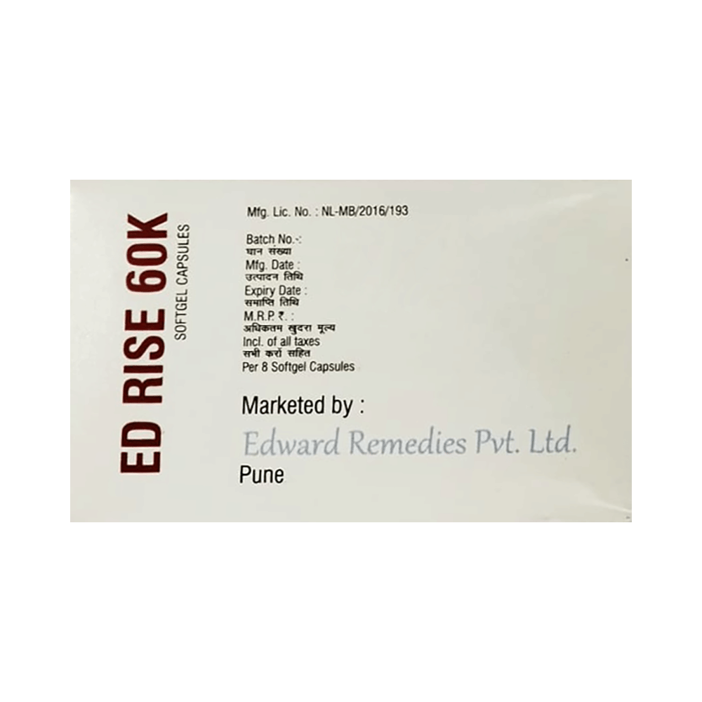 Take this medicine in the dose and duration as advised by your doctor. Swallow it as a whole. Do not chew, crush or break it. ED Rise 60K Softgel Capsule is to be taken with food.