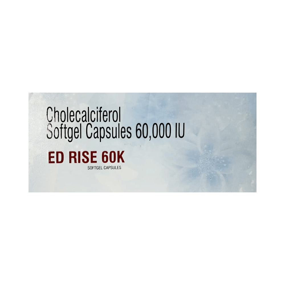 ED Rise 60K Softgel Capsule is used in the treatment of vitamin D deficiency and osteoporosis. It helps the body to absorb calcium. Calcium is essential for maintaining strong and healthy bones. It is used when your diet does not provide enough calcium. ED Rise 60K Softgel Capsule should be taken as directed by your doctor. It is best taken with or after food, as this helps your body absorb it, and you should take it regularly to get the most benefits. If you are using it to treat osteoporosis, you will also be prescribed other medicines. This medicine may be only part of a complete treatment program that includes making changes to your diet and taking calcium and vitamin supplements. Learn about the foods you should eat to ensure you get enough calcium and vitamin D.ED Rise 60K Softgel Capsule has few side effects, and none are common. If you take too much, you may feel weakness, muscle pain, or a metallic taste in your mouth. If you experience any such side effects, speak with your doctor. They may be able to help you reduce or treat the symptoms.Before taking this medicine, tell your doctor if you have high calcium levels in your blood or if you have any heart, kidney, or liver disease. Some other medicines can decrease the absorption of vitamin D3, so let your doctor know about all the other medicines you are taking to make sure you are safe. This medicine may help during pregnancy when your body needs more vitamin D, but too much could harm your baby. Discuss it with your doctor.