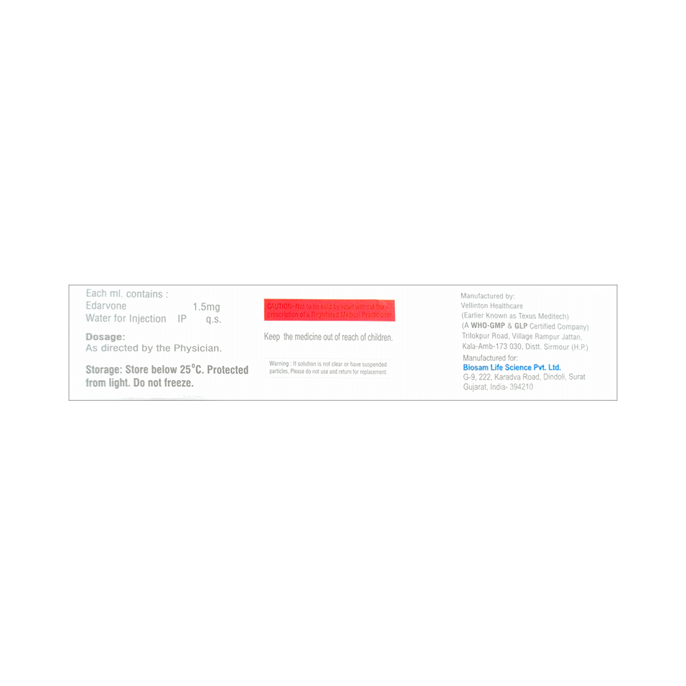 Edasam Injection is an antioxidant. It has nootropic (enrichment of nerves) and neuroprotective properties. It works by slowing the nerve damage caused by harmful chemicals (free radicals). This delays the progression of amyotrophic lateral sclerosis (ALS) symptoms by reducing oxidative stress (an imbalance between free radicals and antioxidants) in the brain. It also protects brain cells during ischemic stroke by reducing harmful molecules (free radicals) that cause damage.