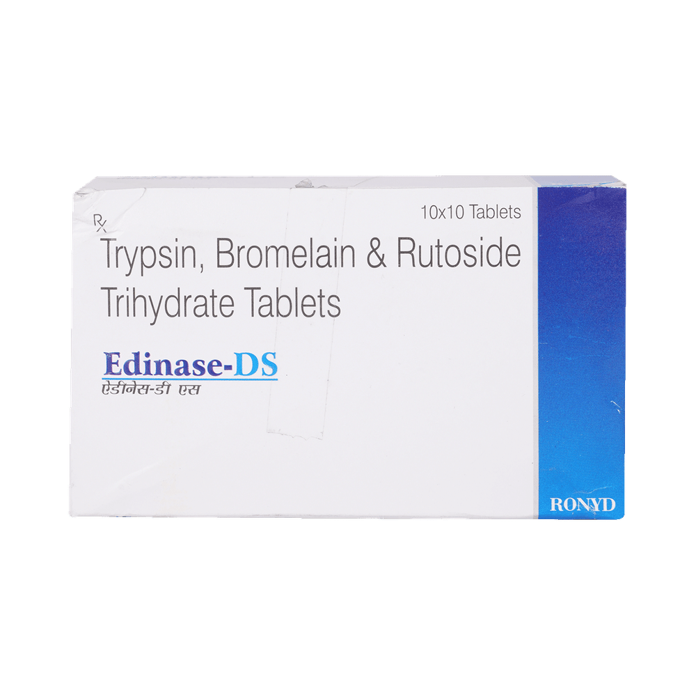 Edinase -DS Tablet is a combination of two enzymes (Bromelain, Trypsin) and an antioxidant (Rutoside). The enzymes work by increasing the blood supply to the affected area and helping the body produce substances that fight pain and swelling. The antioxidant protects the body from damage by chemicals (free radicals) and further reduces swelling.