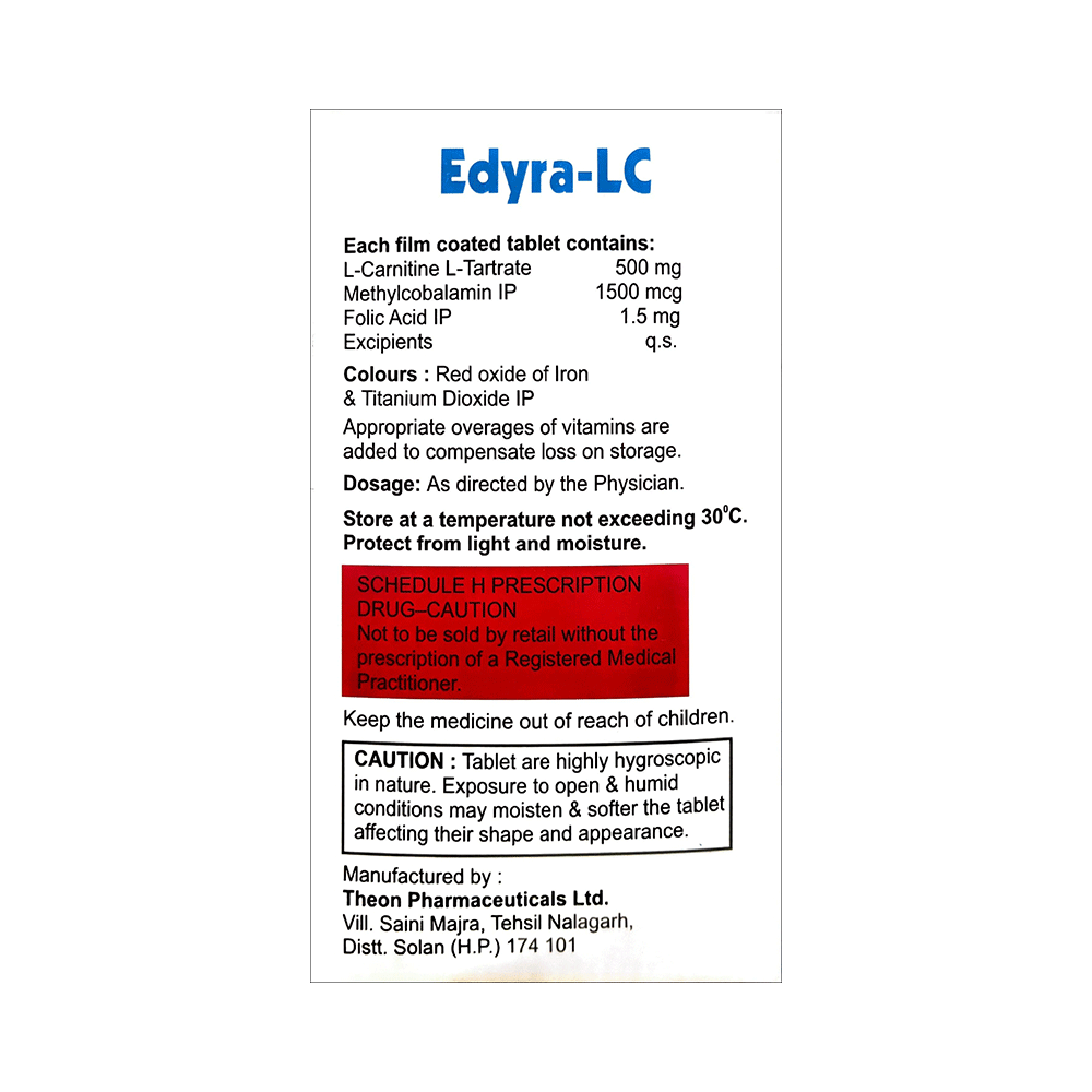 Edyra-LC Tablet is a combination of vitamin B9, B12, L-carnitine L-tartrate. Folic acid is essential for production of red blood cells. It prevents and treats folate deficiency and anemia. When taken by pregnant women, Folic acid prevents miscarriage, preterm labor, and neural tube defects in infants. Levo-carnitine L-tartrate helps turn the fats present in ingested food into energy. It decreases insulin resistance and oxidative stress and improves immune function. Methylcobalamin corrects vitamin B12 deficiency thereby helping in treating certain anemias and nerve problems.