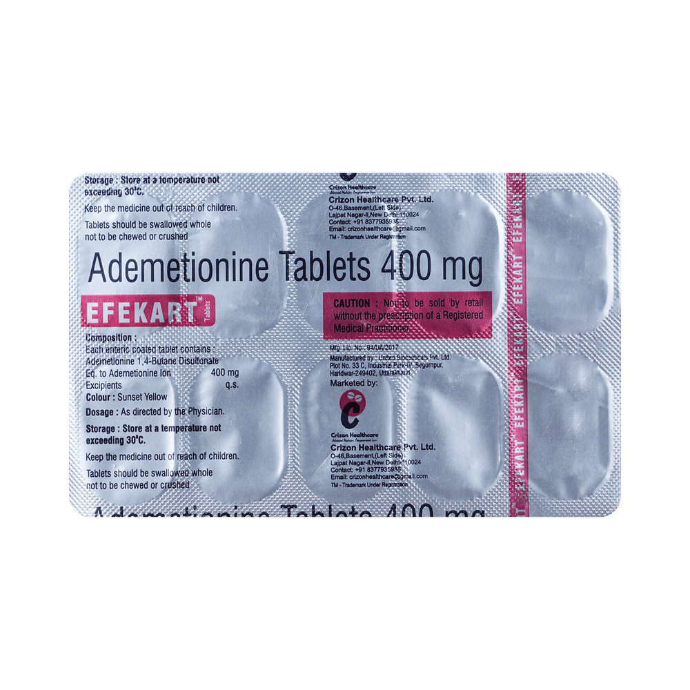 Efekart 400mg Tablet works by helping the liver make and restore important substances that protect its cells. It increases the liver’s natural antioxidants, reduces damage from toxins, and improves the flow of bile. This supports healthier liver function in conditions like intrahepatic cholestasis and chronic liver disease.