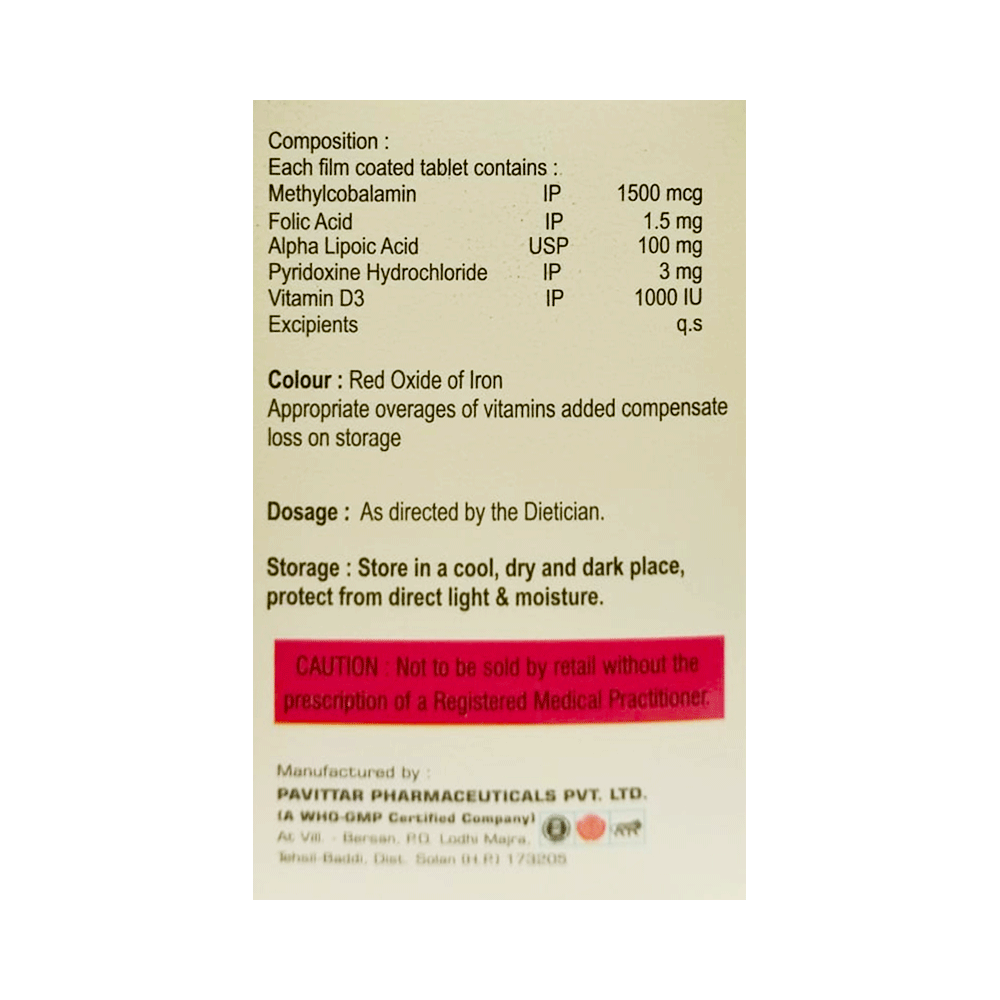 Salt Composition: Methylcobalamin (1500mcg) + Alpha Lipoic Acid (100mg) + Vitamin B6 (Pyridoxine) (3mg) + Folic Acid (1.5mg) + Vitamin D3 (1000IU)