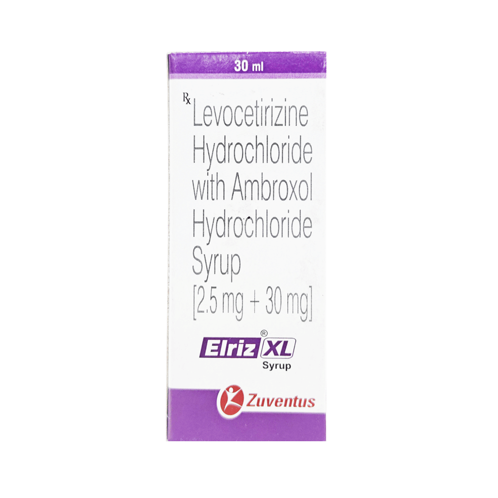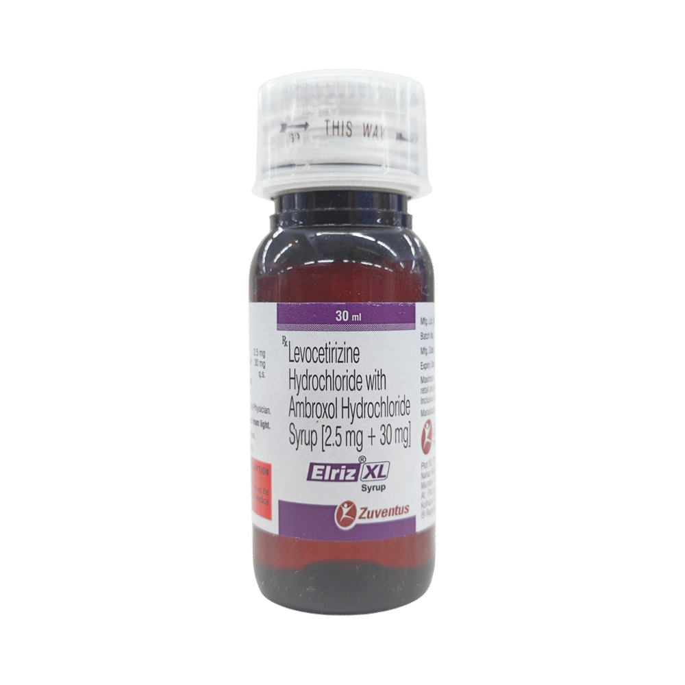 Elriz XL Syrup is a combination medicine used in the treatment of cough. It relieves allergic symptoms such as sneezing, running nose, watery eyes, itching, swelling, and congestion or stiffness. It also thins and loosens mucus, making it easier to cough out. Elriz XL Syrup is taken with or without food in a dose and duration as advised by the doctor. The dose you are given will depend on your condition and how you respond to the medicine. You should keep taking this medicine for as long as your doctor recommends. If you stop treatment too early your symptoms may come back and your condition may worsen. Let your doctor know about all other medications you are taking as some may affect, or be affected by this medicine.The most common side effects are stomach upset, dryness in mouth, headache, fatigue, and allergic reaction. Most of these are temporary and usually resolve with time. Contact your doctor straight away if you are at all concerned about any of these side effects. This medicine can also cause dizziness and sleepiness, so do not drive or do anything that requires mental focus until you know how this medicine affects you. Avoid drinking alcohol while taking this medicine as it can make dizziness worse.Never support self-medication or recommend your medicine to another person. It is beneficial to have plenty of fluids while taking this medication. Before taking it, you should tell your doctor if you have any kidney and liver diseases. Pregnant or breastfeeding women should also consult their doctor before taking this medicine.