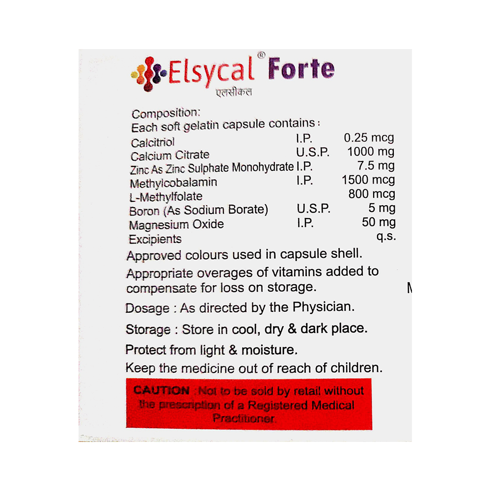 Elsycal Forte Softgel Capsule is a medicine that is used to treat nutritional deficiencies. It helps in the proper growth and development of cells and bones and improves heart health. It also helps in protein synthesis and the production of blood cells, like red blood cells or white blood cells, and supports immunity. Elsycal Forte Softgel Capsule may be taken with or without food. It should be taken in the dose and duration as prescribed by your doctor. It is advised to take this medicine at a fixed time.Elsycal Forte Softgel Capsule is usually safe with very minimal or no side effects, such as diarrhea or constipation. Usually, these side effects are temporary and subside on their own as the body adjusts to the medicine. In case these side effects become severe or you experience rash or itching after taking it, consult with your doctor.Before taking Elsycal Forte Softgel Capsule, tell your doctor if you have issues with your liver, kidneys, or heart. Inform your doctor if you are taking any other medicines or if you are pregnant or breastfeeding.