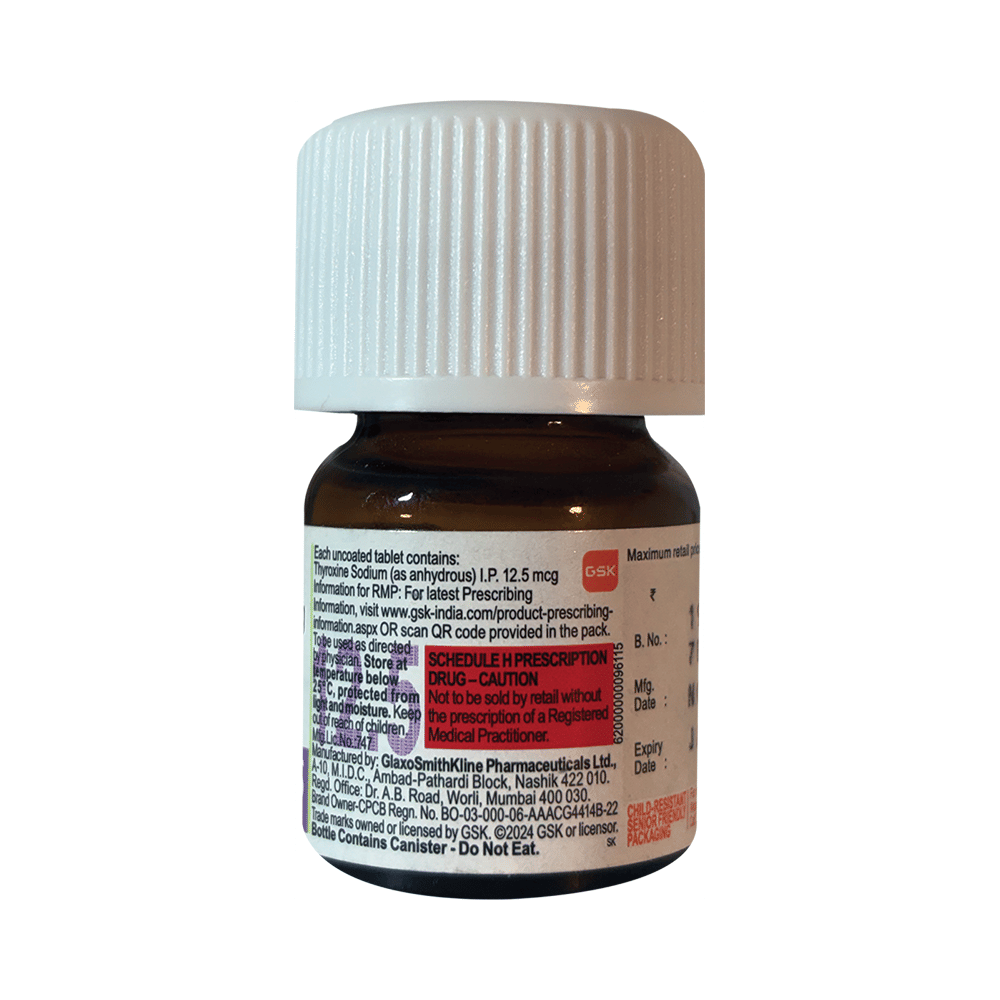 Eltroxin 12.5mcg Tablet is a medicine used to treat an underactive thyroid gland (hypothyroidism). It replaces the hormone which is not being produced by your thyroid gland in sufficient quantity and helps regulate your body’s energy and metabolism. Before you start taking Eltroxin 12.5mcg Tablet, your doctor will do a blood test to see what dose you need. Once you start taking the medicine, you will have regular blood tests to see how well it is working, and the dose may be adjusted from time to time. It is best taken on an empty stomach before your first meal of the day. You should take this medicine regularly to get the maximum benefit. It may take several weeks before your symptoms start to improve. You may need to take it for the rest of your life. If you stop taking it, your symptoms are likely to come back.The most common side effects of this medicine are caused by taking a higher dose than you need. Possible side effects include palpitations (irregular heartbeat), vomiting, anxiety, diarrhea, weight loss, tremors, increased appetite, and restlessness. Most side effects will disappear once you are on the right dose. Call your doctor straight away if you have a very high temperature, fast or irregular heart rate, low blood pressure, yellowness in the eye/skin, confusion, or fits.Eltroxin 12.5mcg Tablet may cause weight loss but should not be prescribed or taken to treat obesity. If you become pregnant while taking this medicine, inform your doctor right away as the dose may have to be increased/readjusted. Many other drugs affect the way this medicine works. Ask your doctor for advice if you are taking any other medications.