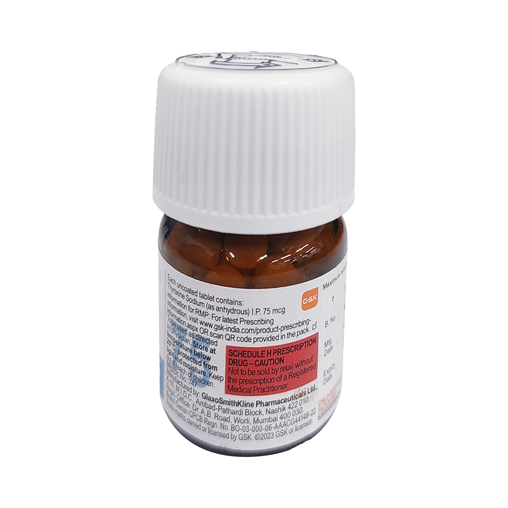 Eltroxin 75mcg Tablet is a medicine used to treat an underactive thyroid gland (hypothyroidism). It replaces the hormone which is not being produced by your thyroid gland in sufficient quantity and helps regulate your body’s energy and metabolism. Before you start taking Eltroxin 75mcg Tablet, your doctor will do a blood test to see what dose you need. Once you start taking the medicine, you will have regular blood tests to see how well it is working, and the dose may be adjusted from time to time. It is best taken on an empty stomach before your first meal of the day. You should take this medicine regularly to get the maximum benefit. It may take several weeks before your symptoms start to improve. You may need to take it for the rest of your life. If you stop taking it, your symptoms are likely to come back.The most common side effects of this medicine are caused by taking a higher dose than you need. Possible side effects include palpitations (irregular heartbeat), vomiting, anxiety, diarrhea, weight loss, tremors, increased appetite, and restlessness. Most side effects will disappear once you are on the right dose. Call your doctor straight away if you have a very high temperature, fast or irregular heart rate, low blood pressure, yellowness in the eye/skin, confusion, or fits.Eltroxin 75mcg Tablet may cause weight loss but should not be prescribed or taken to treat obesity. If you become pregnant while taking this medicine, inform your doctor right away as the dose may have to be increased/readjusted. Many other drugs affect the way this medicine works. Ask your doctor for advice if you are taking any other medications.