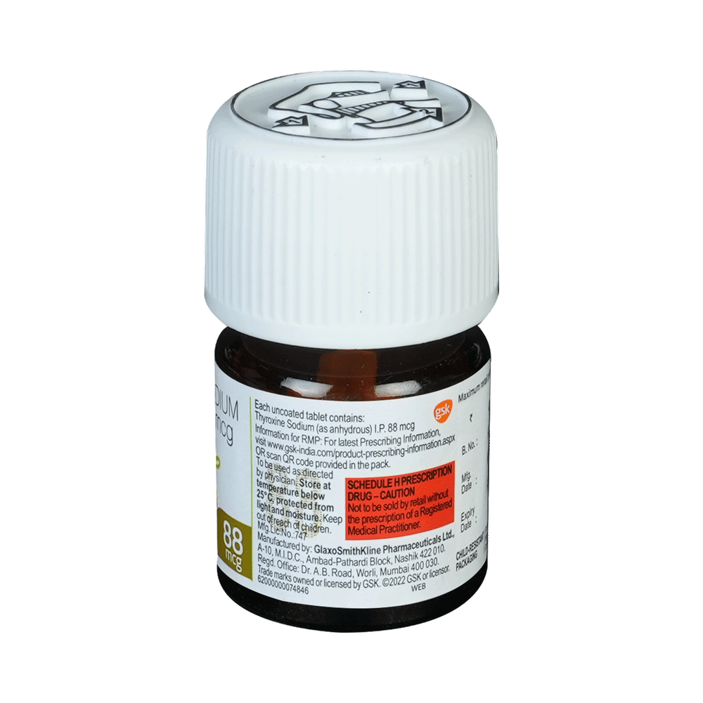 Eltroxin 88mcg Tablet is a medicine used to treat an underactive thyroid gland (hypothyroidism). It replaces the hormone which is not being produced by your thyroid gland in sufficient quantity and helps regulate your body’s energy and metabolism. Before you start taking Eltroxin 88mcg Tablet, your doctor will do a blood test to see what dose you need. Once you start taking the medicine, you will have regular blood tests to see how well it is working, and the dose may be adjusted from time to time. It is best taken on an empty stomach before your first meal of the day. You should take this medicine regularly to get the maximum benefit. It may take several weeks before your symptoms start to improve. You may need to take it for the rest of your life. If you stop taking it, your symptoms are likely to come back.The most common side effects of this medicine are caused by taking a higher dose than you need. Possible side effects include palpitations (irregular heartbeat), vomiting, anxiety, diarrhea, weight loss, tremors, increased appetite, and restlessness. Most side effects will disappear once you are on the right dose. Call your doctor straight away if you have a very high temperature, fast or irregular heart rate, low blood pressure, yellowness in the eye/skin, confusion, or fits.Eltroxin 88mcg Tablet may cause weight loss but should not be prescribed or taken to treat obesity. If you become pregnant while taking this medicine, inform your doctor right away as the dose may have to be increased/readjusted. Many other drugs affect the way this medicine works. Ask your doctor for advice if you are taking any other medications.