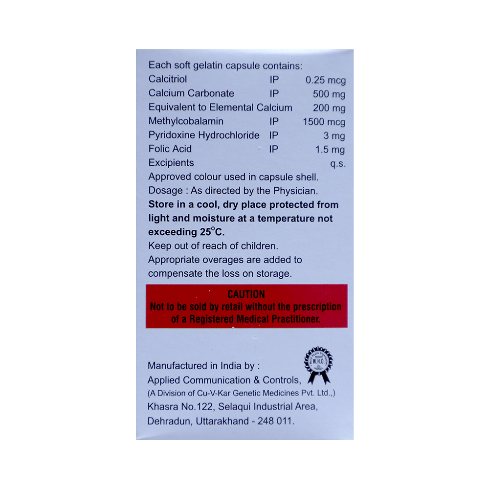 Salt Composition: Calcium (500mg) + Calcitriol (0.25mcg) + Methylcobalamin (1500mcg) + Folic Acid (1.5mg) + Vitamin B6 (Pyridoxine) (3mg)