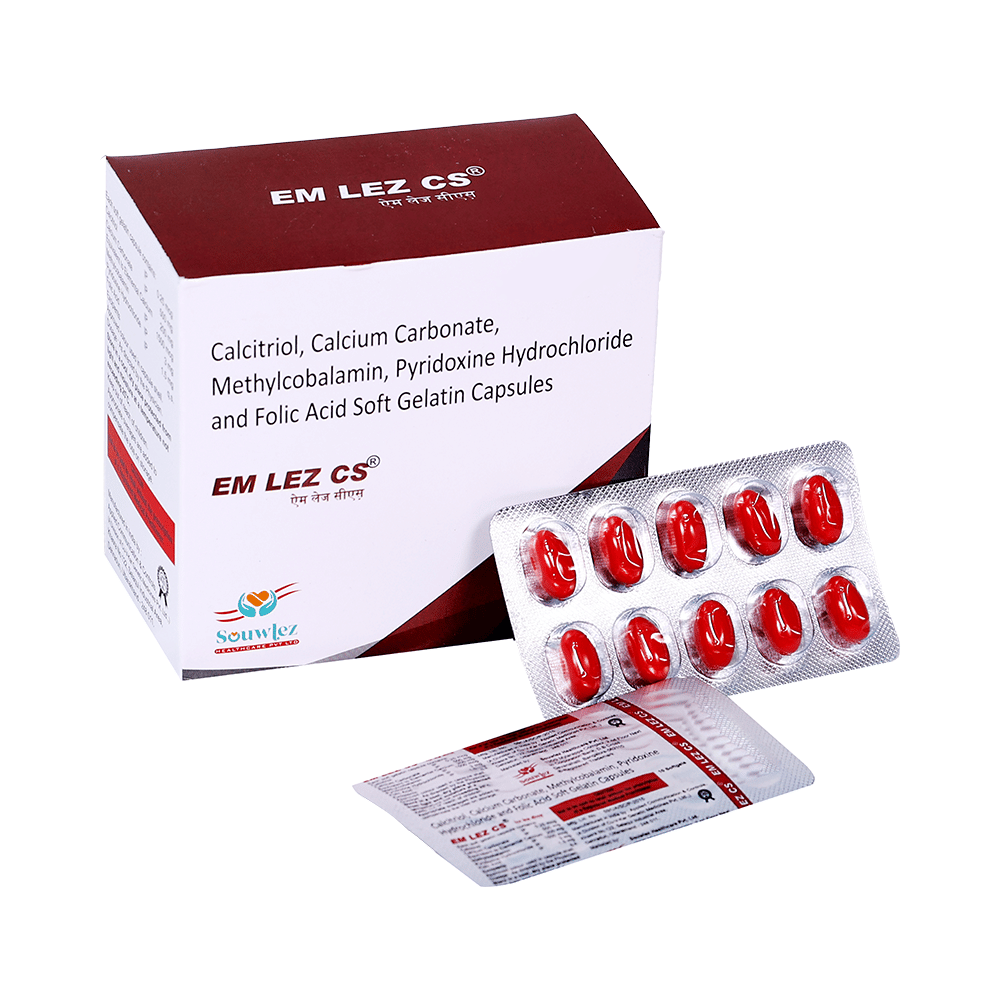 Em Lez CS Softgel Capsule is a combination of five nutritional supplements. Calcium increases calcium deposition in the bones, which increases the density of the bones and makes them stronger. Calcitriol is a synthetic vitamin D that regulates the absorption of calcium in the body and strengthens the bones. Methylcobalamin is an active form of vitamin B12. This helps in proper cell growth and development, protein synthesis, and the production of blood cells (red and white blood cells). Folic Acid is also known as folate or vitamin B9. It helps in producing blood (hemoglobin) in the body. Vitamin B6 (Pyridoxine) is a vitamin nutritional supplement that regulates essential metabolic functions. Together, they help in managing nutritional deficiencies.